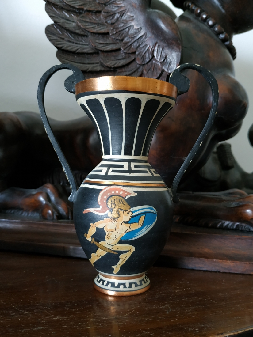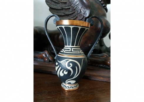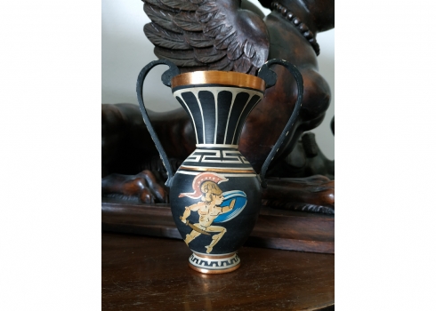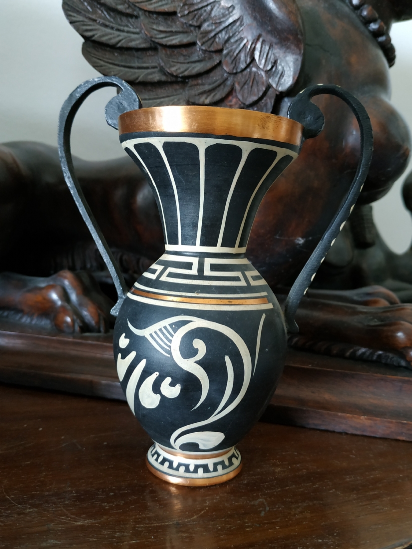 כד נחושת יווני מעוטר באמייל, גובה: 13.5 ס"מ.