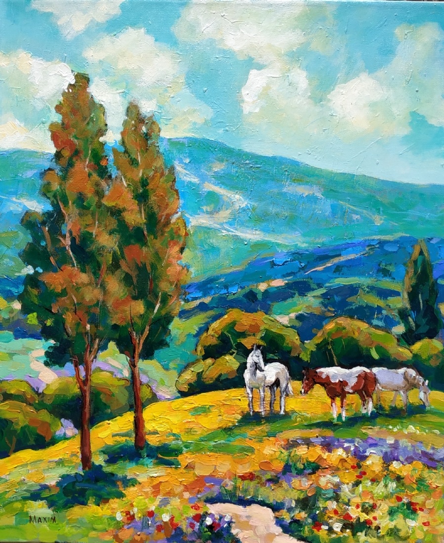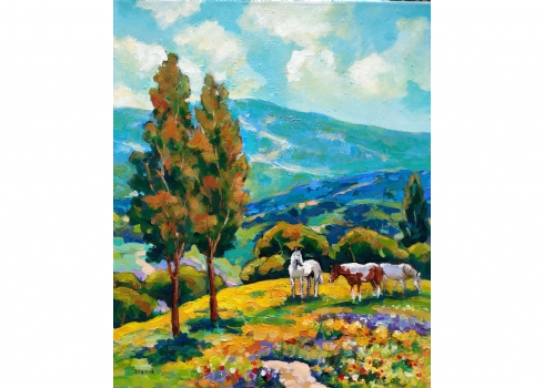 מקסים ברכיאייב - 'שני סוסים ברמת הגולן' - אקריליק על בד, חתום