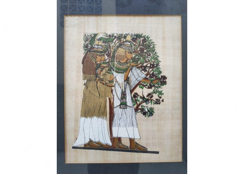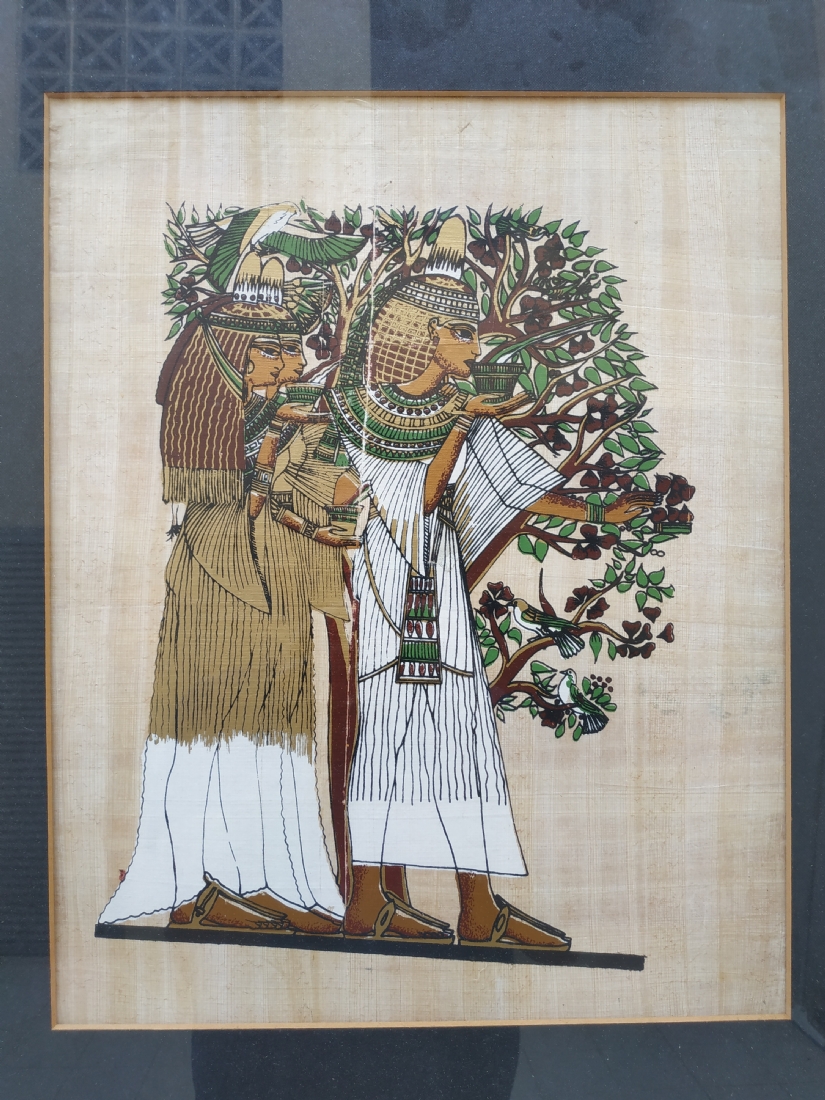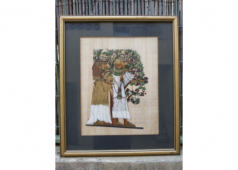 תמונה מצרית ישנה - 'שלוש בנות מצריות', ציור יד על נייר פפירוס, מידות המסגרת: 59X50 ס"מ.