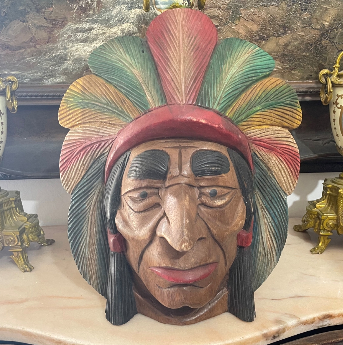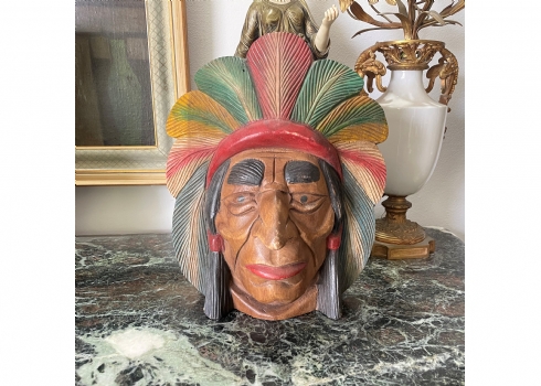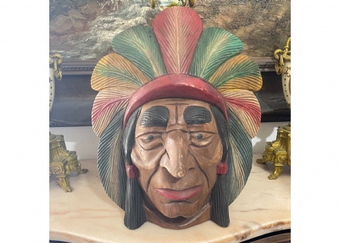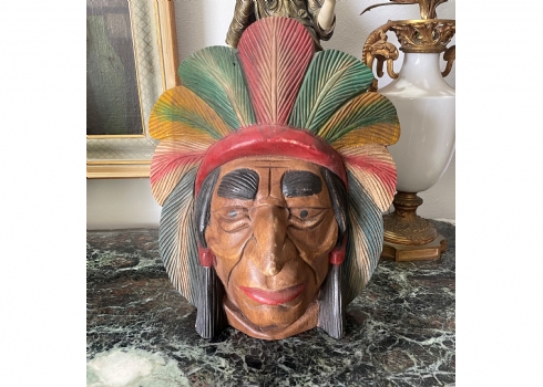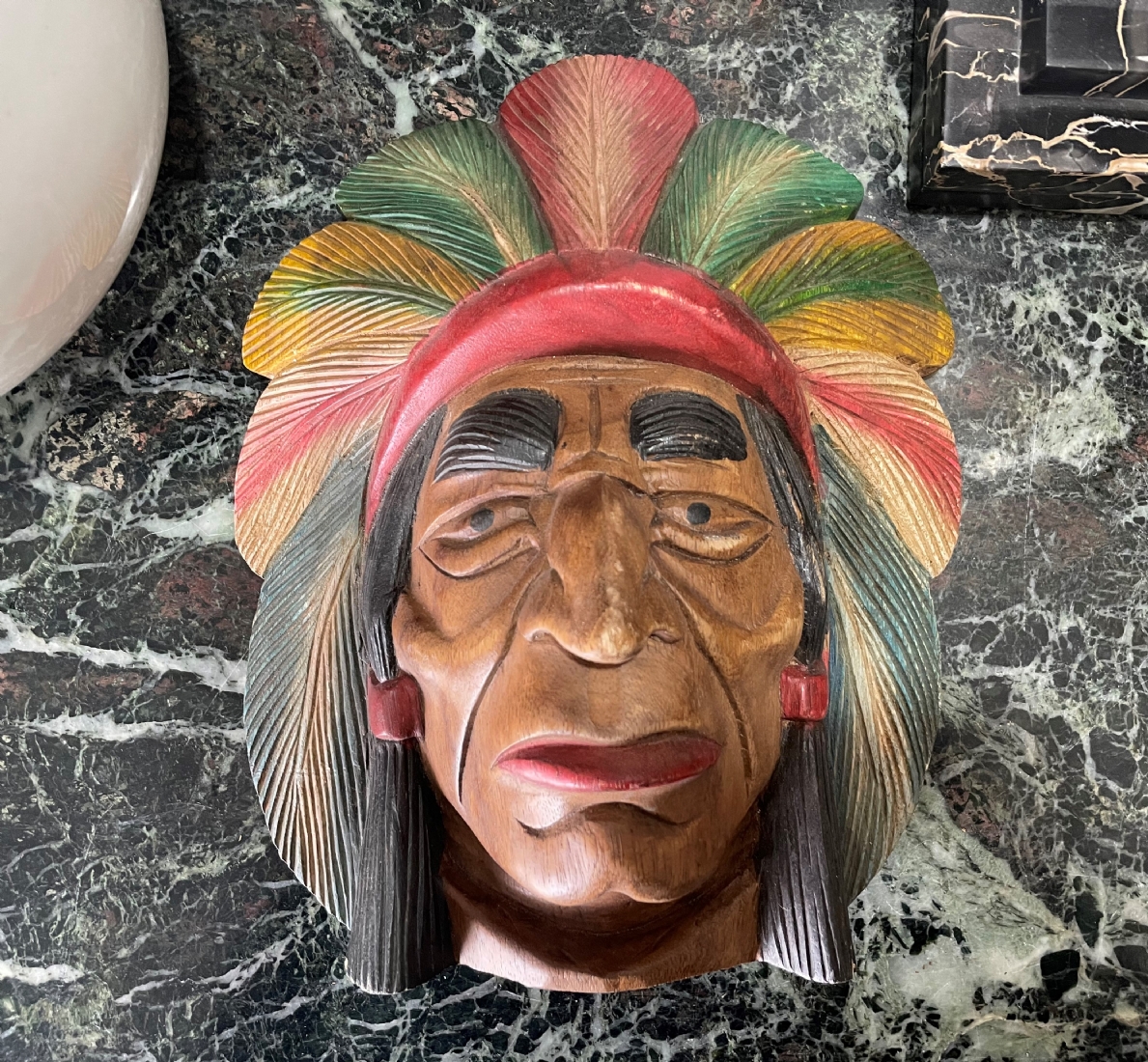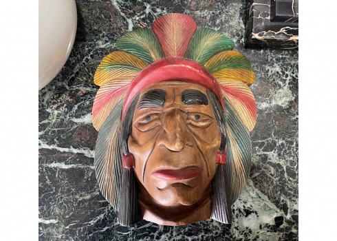 מסכת עץ דקורטיבית בדמות צ'יף אינדיאני, מגולפת וצבועה בעבודת יד, רוחב: 26 ס"מ, גובה: 34 ס"מ.