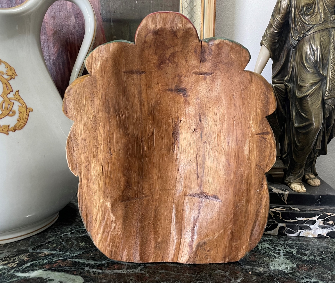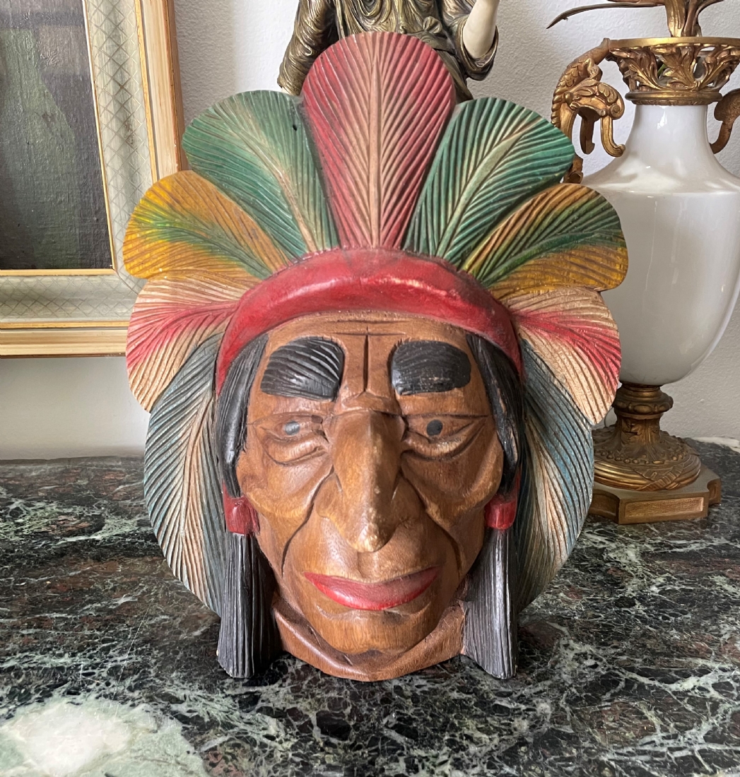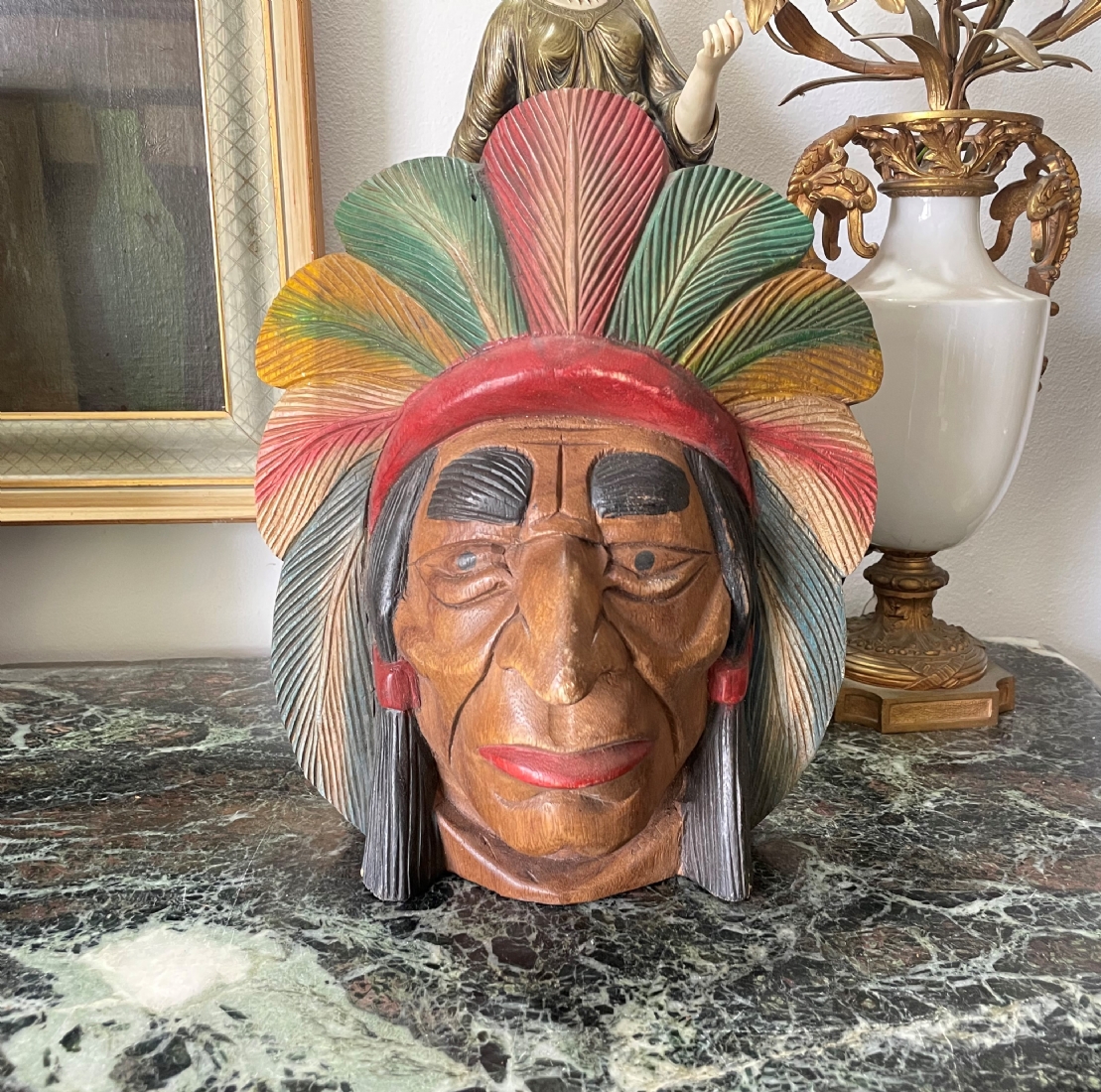 מסכת עץ דקורטיבית בדמות צ'יף אינדיאני, מגולפת וצבועה בעבודת יד, רוחב: 26 ס"מ, גובה: 34 ס"מ.