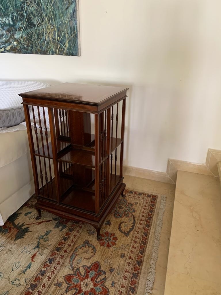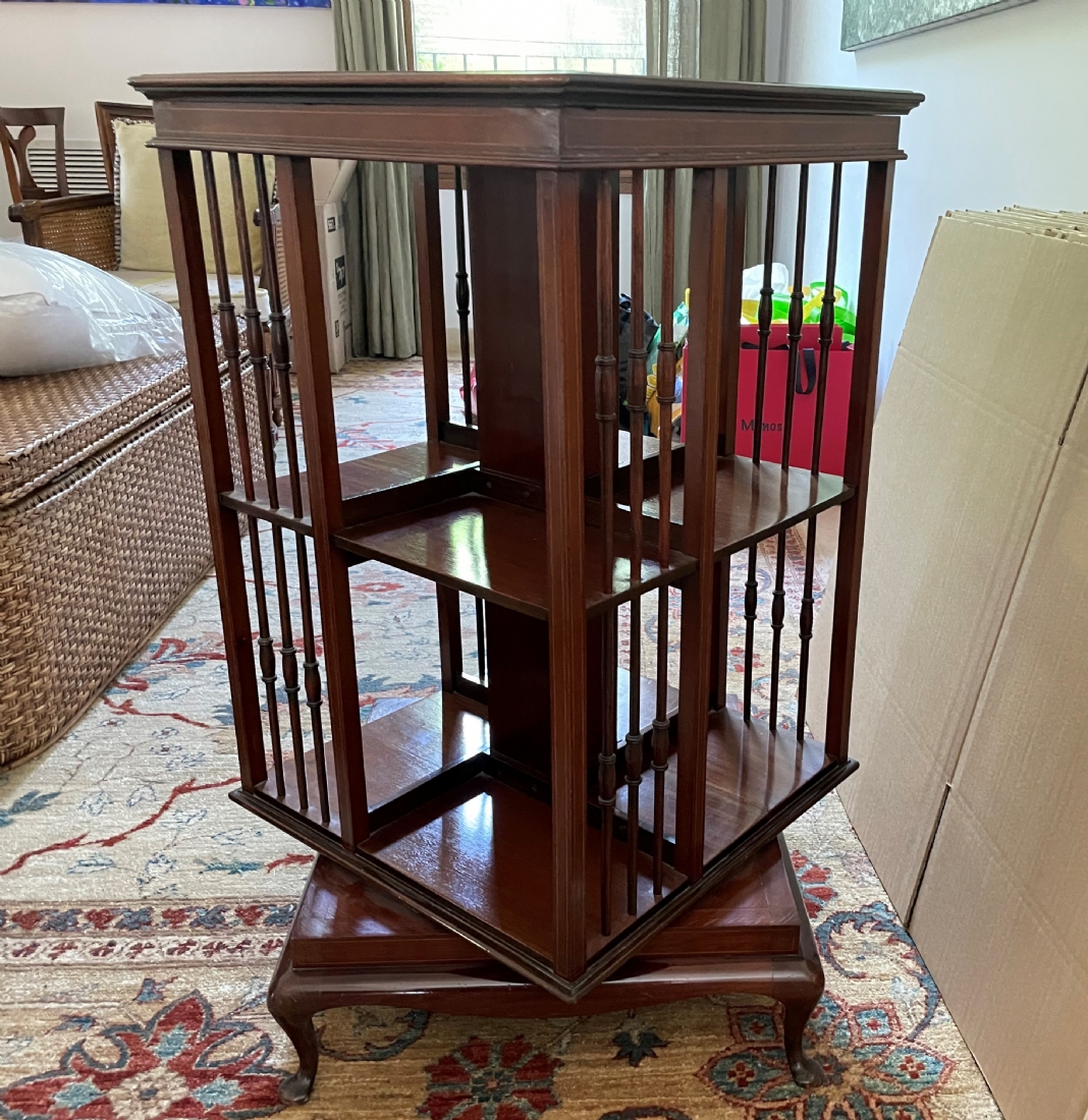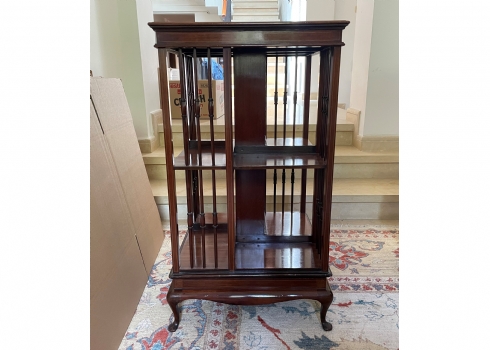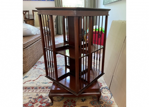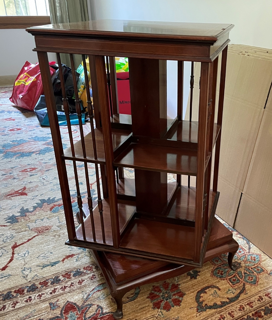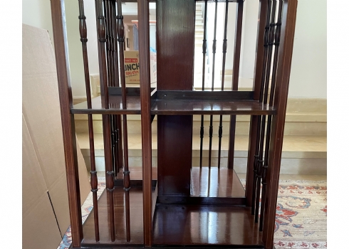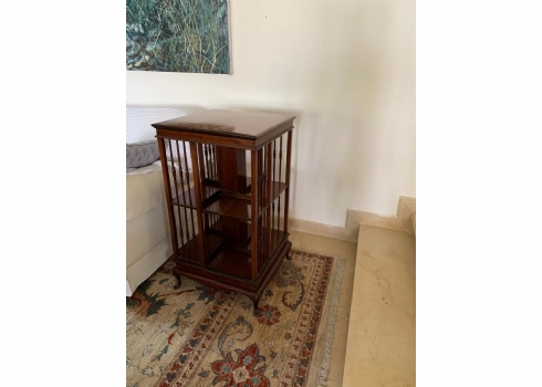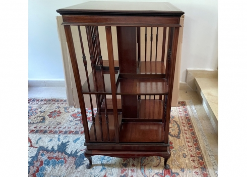 מעמד עץ מסתובב לספרים ומגזינים, עשוי עץ, מידות: 48X48 ס"מ, גובה 87 ס"מ. (מפאת גודלו ומשקלו של הרהיט, הוא הושאר בבית בהרצליה פיתוח - לכן הזוכה בו מתחייב לפנותו מהבית ועל חשבונו תוך שבוע מיום המכרז ובתיאום עם בעלי הבית).