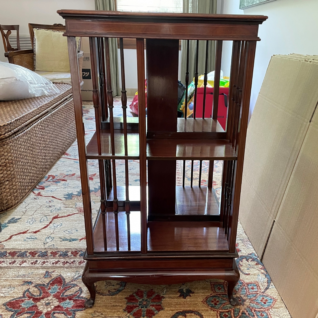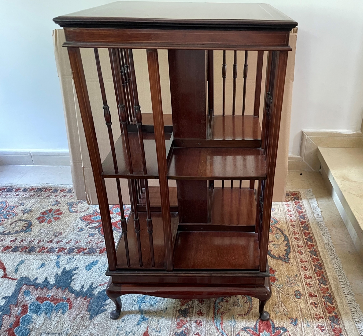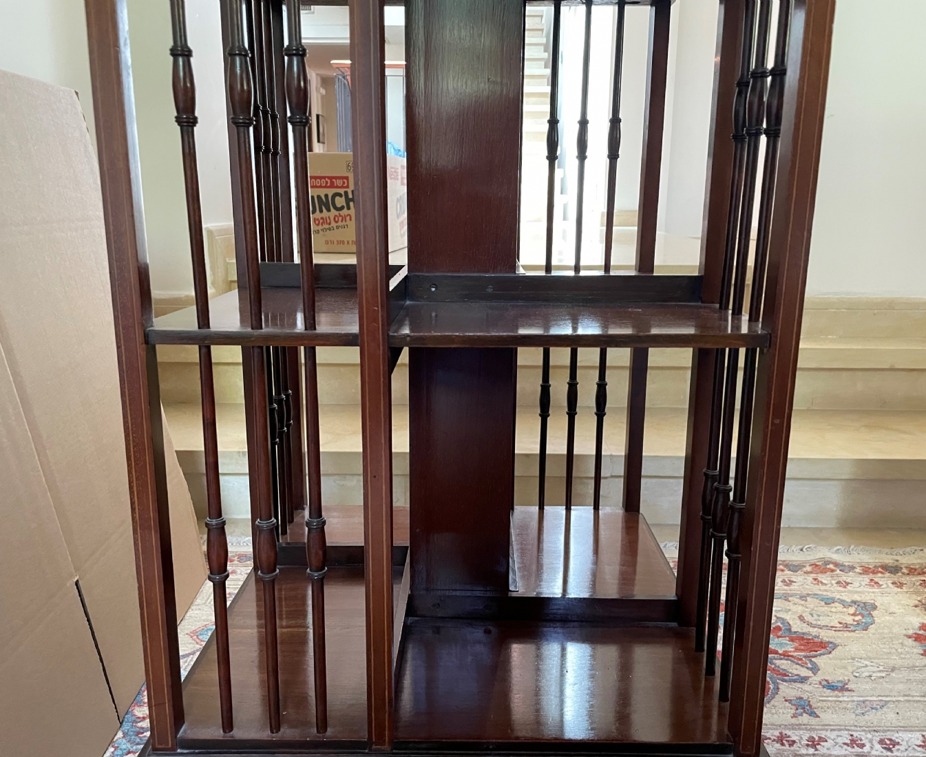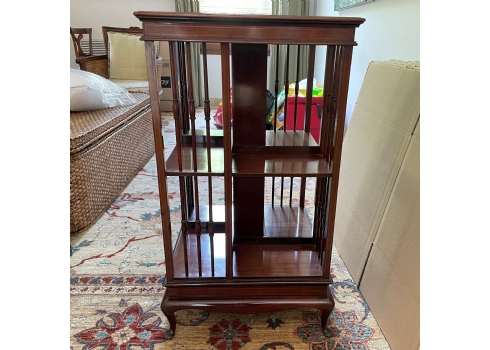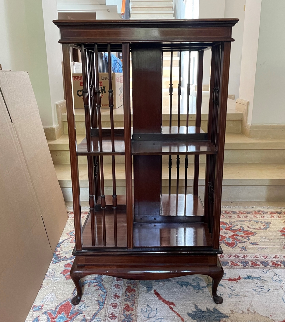 מעמד עץ מסתובב לספרים ומגזינים, עשוי עץ, מידות: 48X48 ס"מ, גובה 87 ס"מ. (מפאת גודלו ומשקלו של הרהיט, הוא הושאר בבית בהרצליה פיתוח - לכן הזוכה בו מתחייב לפנותו מהבית ועל חשבונו תוך שבוע מיום המכרז ובתיאום עם בעלי הבית).
