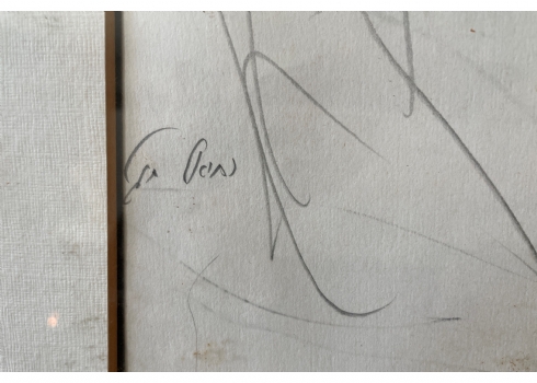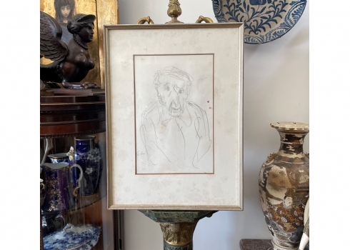 יחיאל סגל (Yehiel Segal) - 'פורטרט עצמי של האמן', רישום עיפרון על נייר, שני כתמים אדומים בצד ימין, חתום בעיפרון, מידות: 37X25 ס"מ.