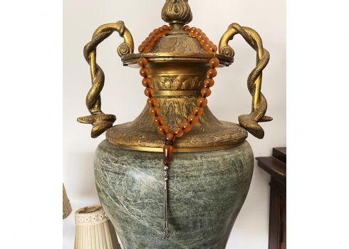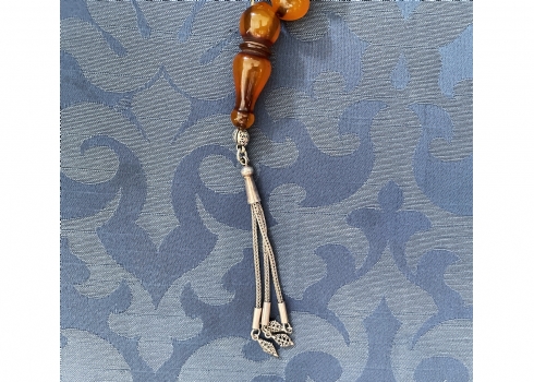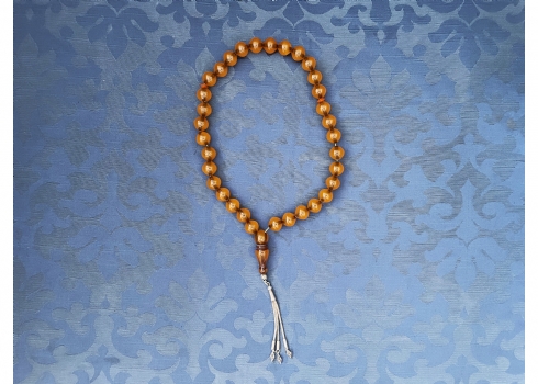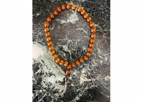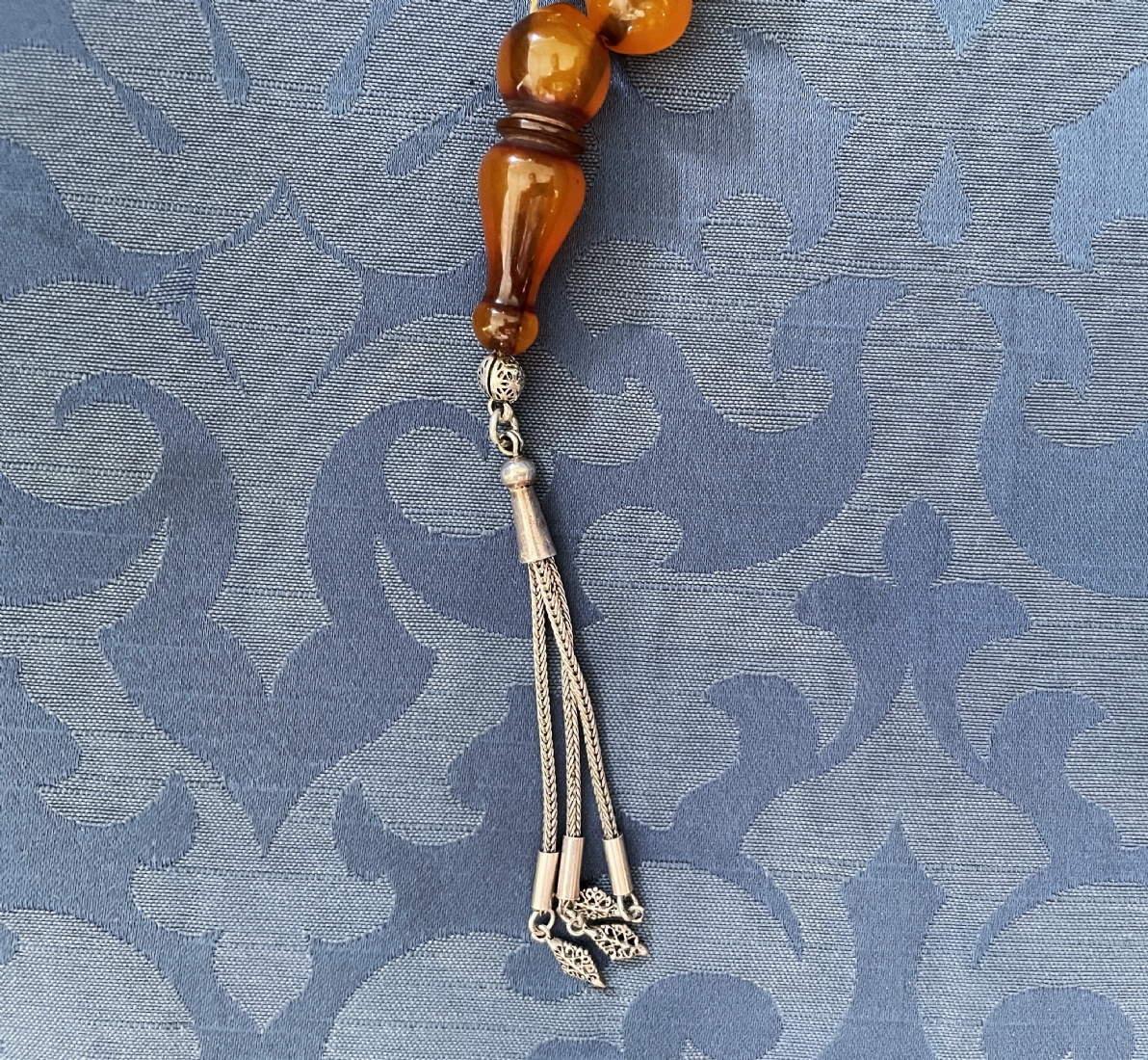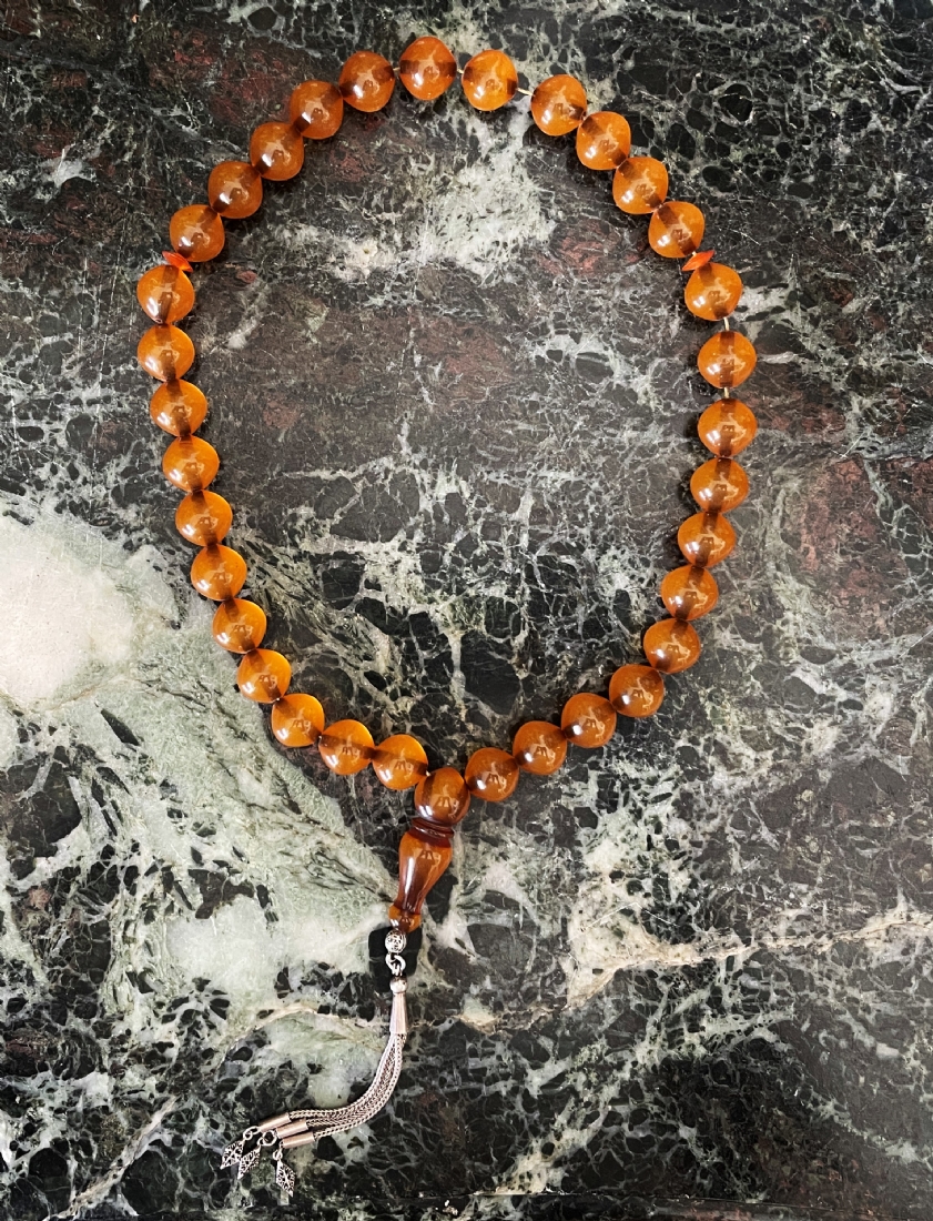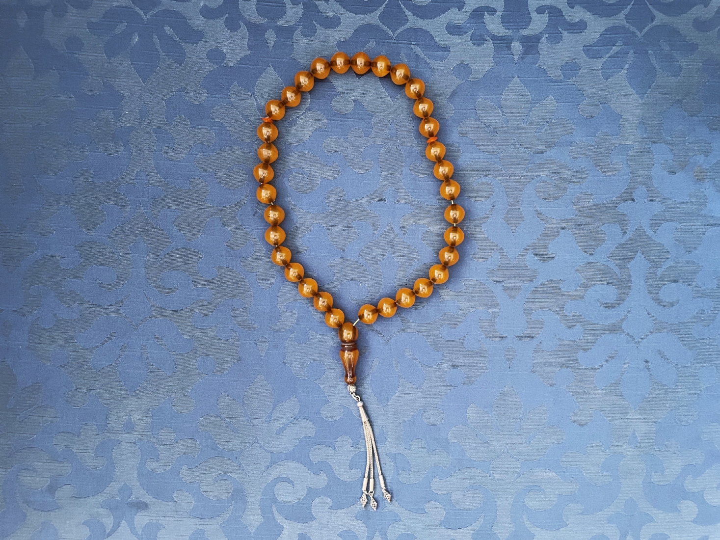 מסבחה (מחרוזת תפילה אסלאמית) שזורה חרוזים מחומר דמוי ענבר, היקף: 40 ס"מ, גובה הגדיל לבדו: 20 ס"מ.