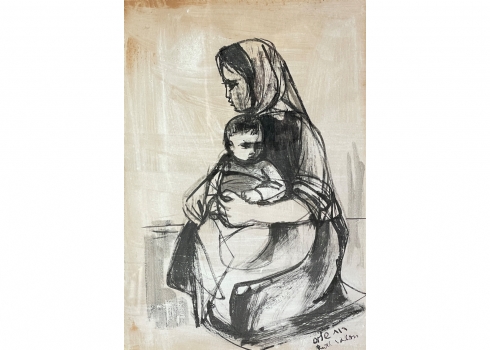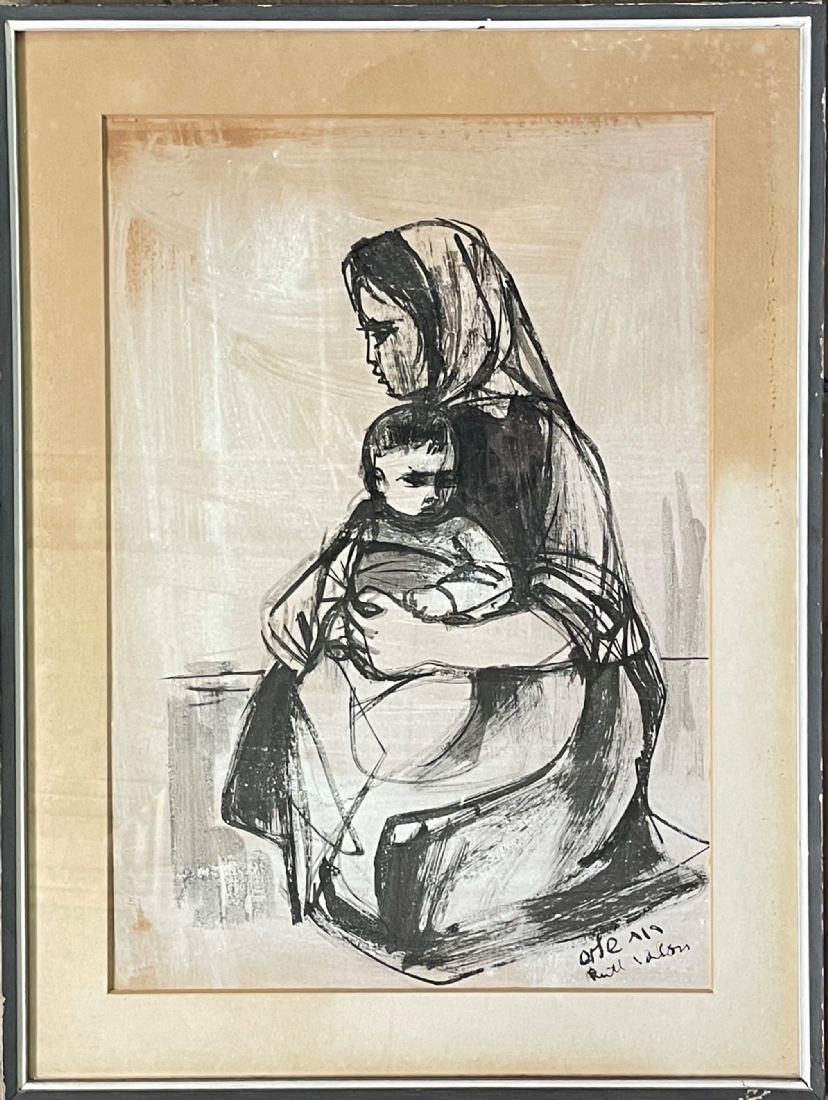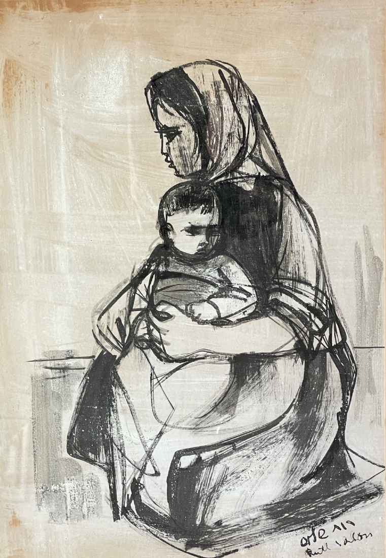 רות שלוס (Ruth Schloss) - 'אם ותינוק' - ציור ישן, גואש ואקוורל על נייר, חתום