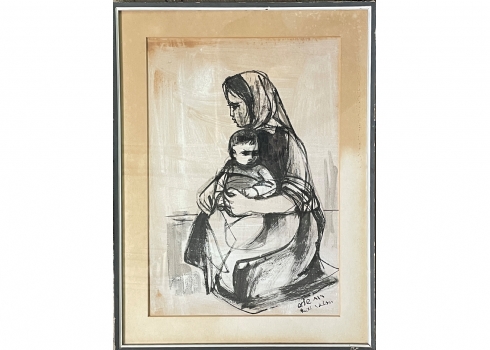 רות שלוס (Ruth Schloss) - 'אם ותינוק' - ציור ישן, גואש ואקוורל על נייר, חתום, מידות: 50X35 ס"מ, מידות המסגרת: 61X46 ס"מ.