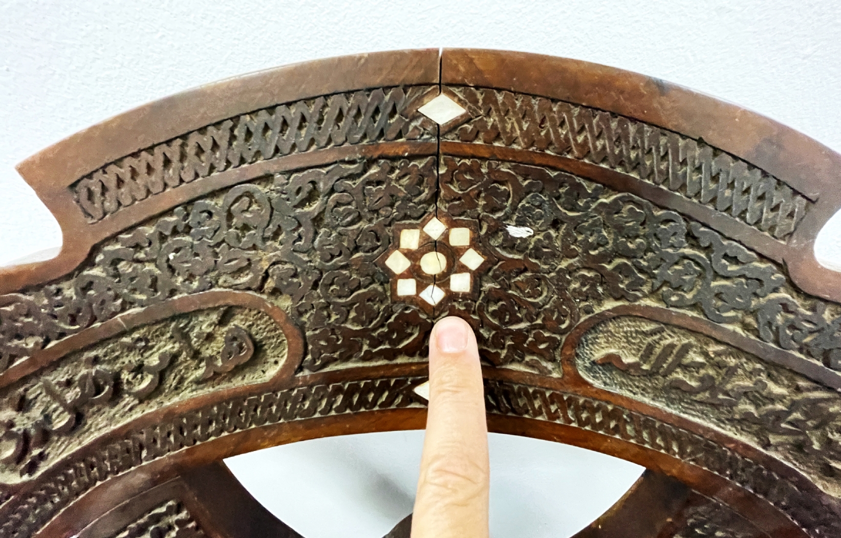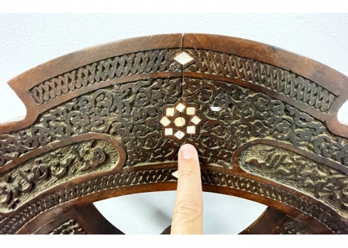 כיסא סבונרולה (Savonarola chair) נקרא גם curule chair סורי (דמשקאי) ישן ויפה במיוחד, עשוי עץ מגולף בעבודת יד, מעוטר בכיתוב ערבי ושיבוץ של פיסות צדף, סדק דק לכותרת העליונה וחריר קטן (מצולם), גובה: 110 ס"מ, רוחב: 63 ס"מ, עומק מהחזית לקיר: 58 ס"מ. (* כיסא סבונרולה הוא כינוי גנרי לכיסאות בסגנון הרנסנס, בעלי צורה אופיינית שבמקור נקראו לפעמים כיסאות קצינים מתקפלים - מתוך האגוזיפדיה).