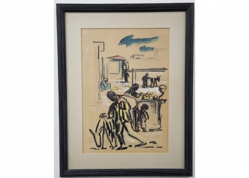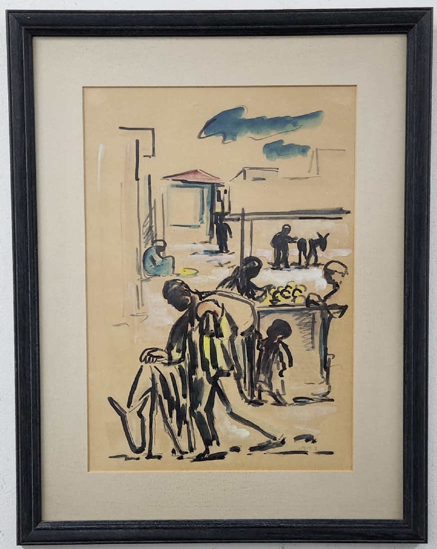 דוד הנדלר (David Hendler) - 'שוק', ציור ישן, אקוורל על נייר, חתום, מידות: 49X34 ס"מ, מידות המסגרת: 68X53 ס"מ.