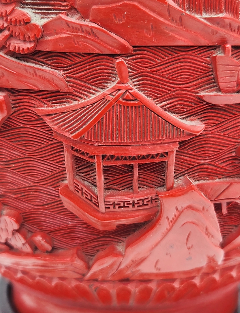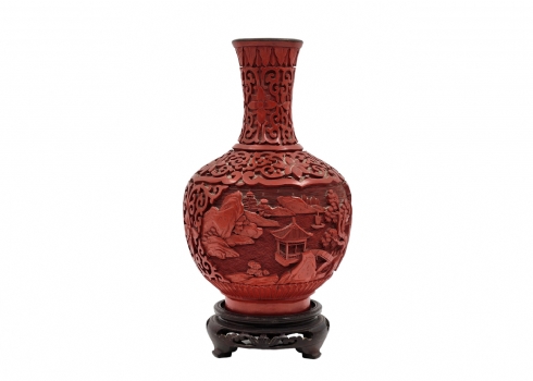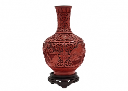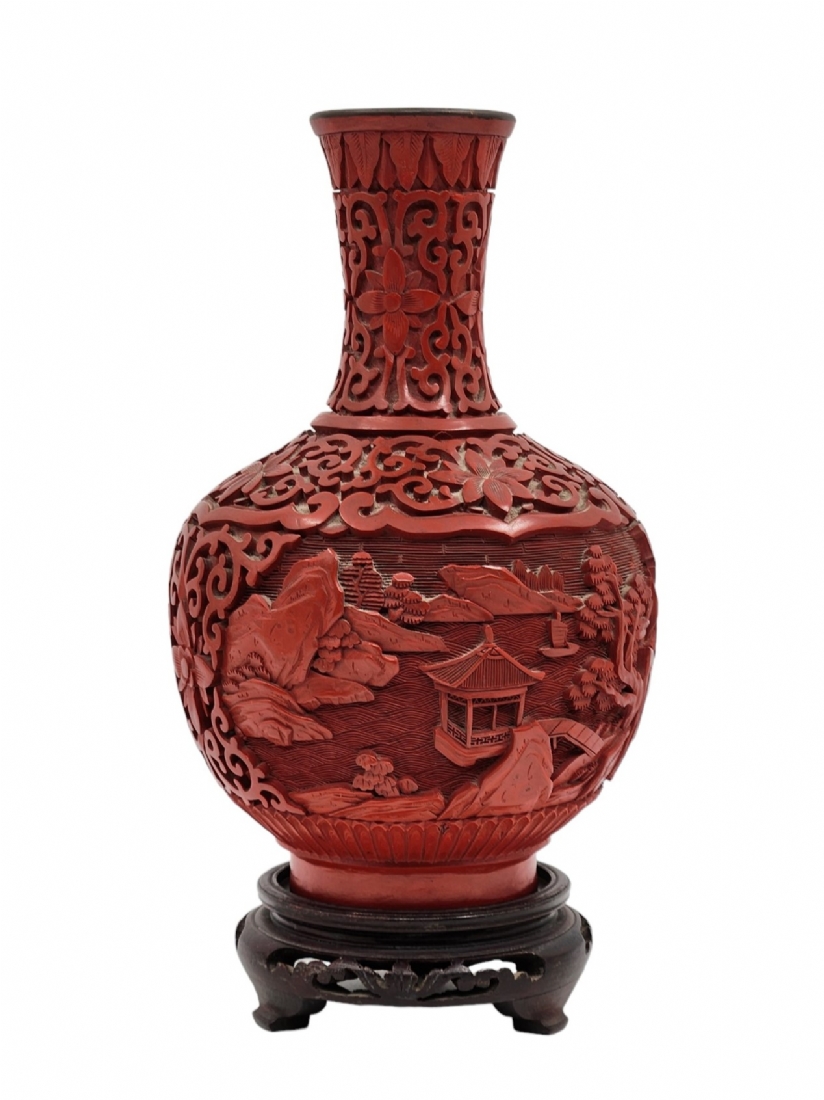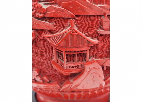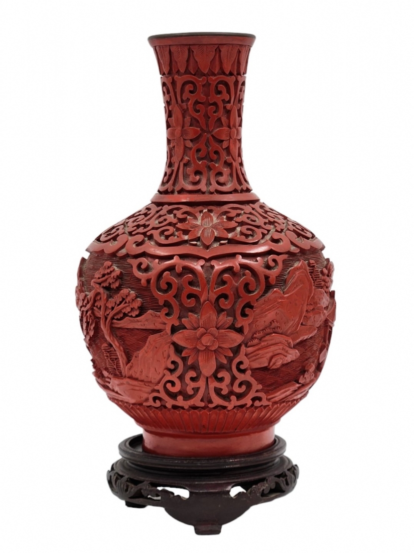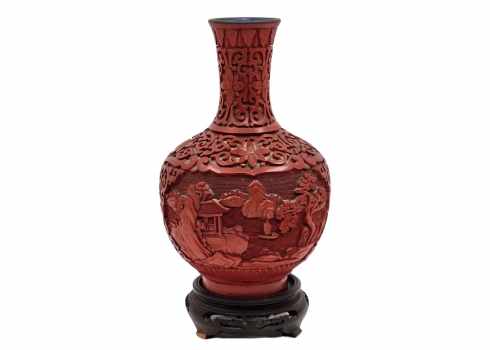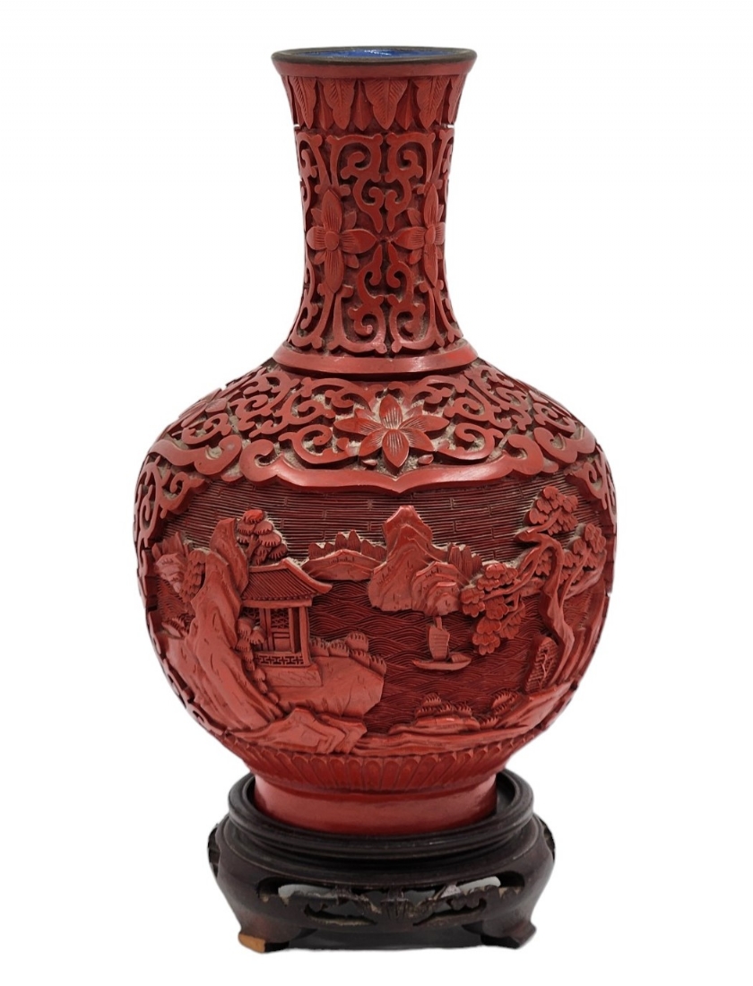עשוי מתכת ומעוטר בלכת סינבאר סינית אדומה (chinese red cinnabar lacquer) יחד עם מעמד עץ