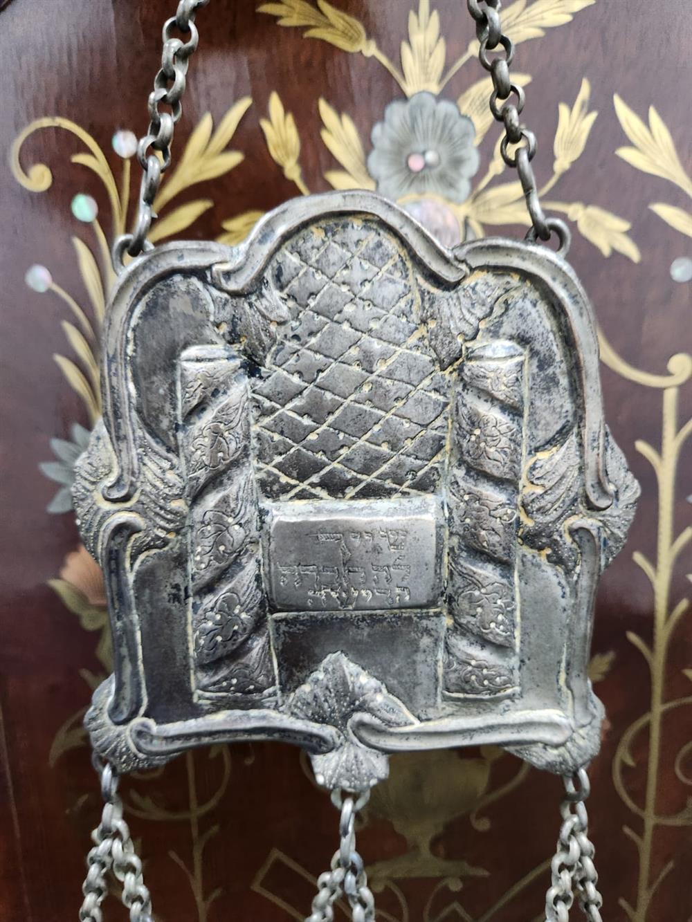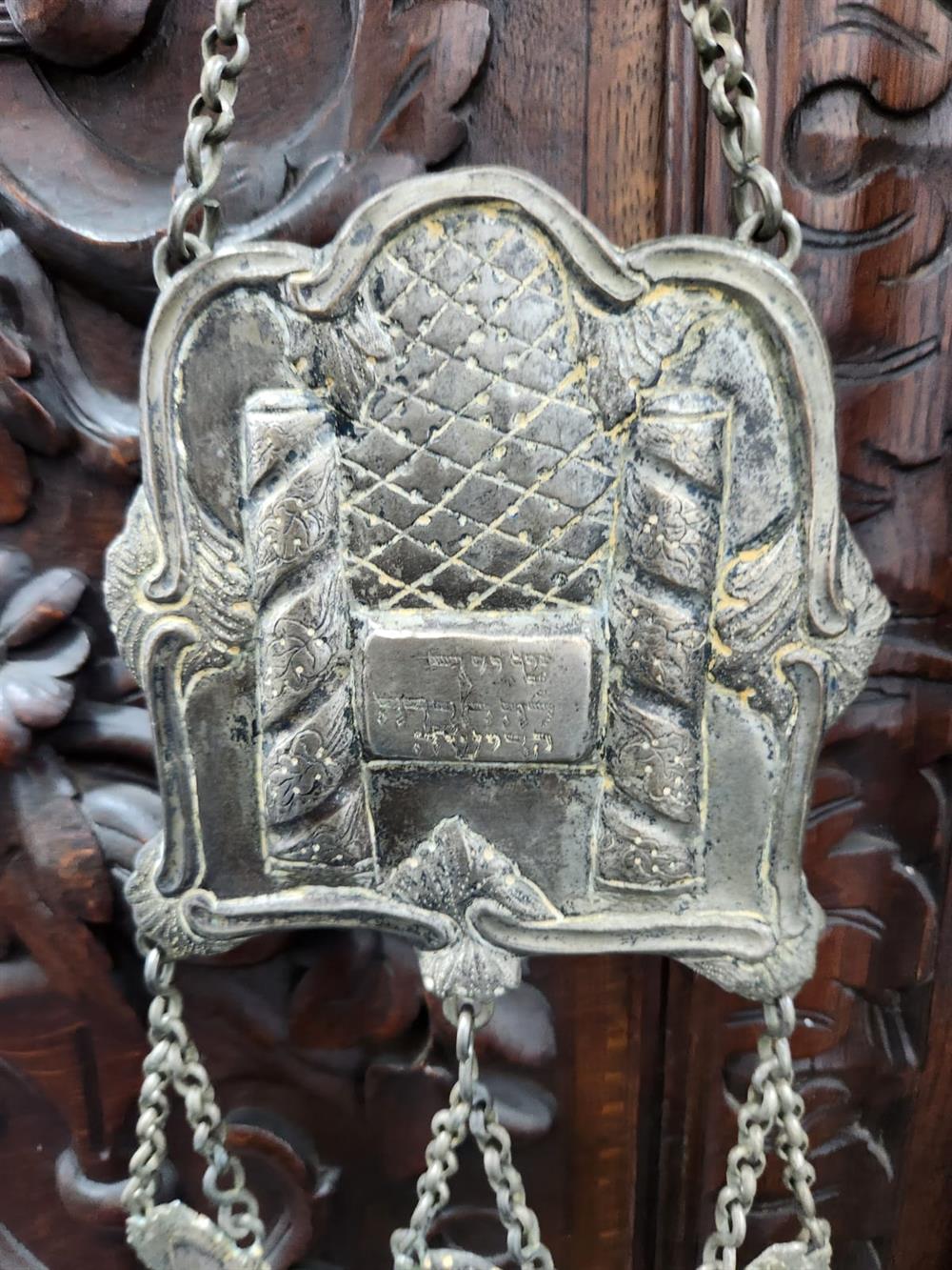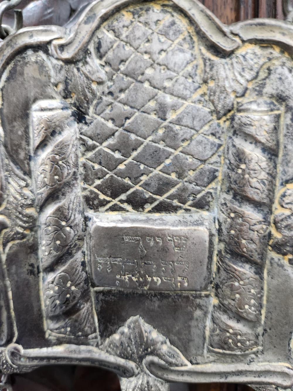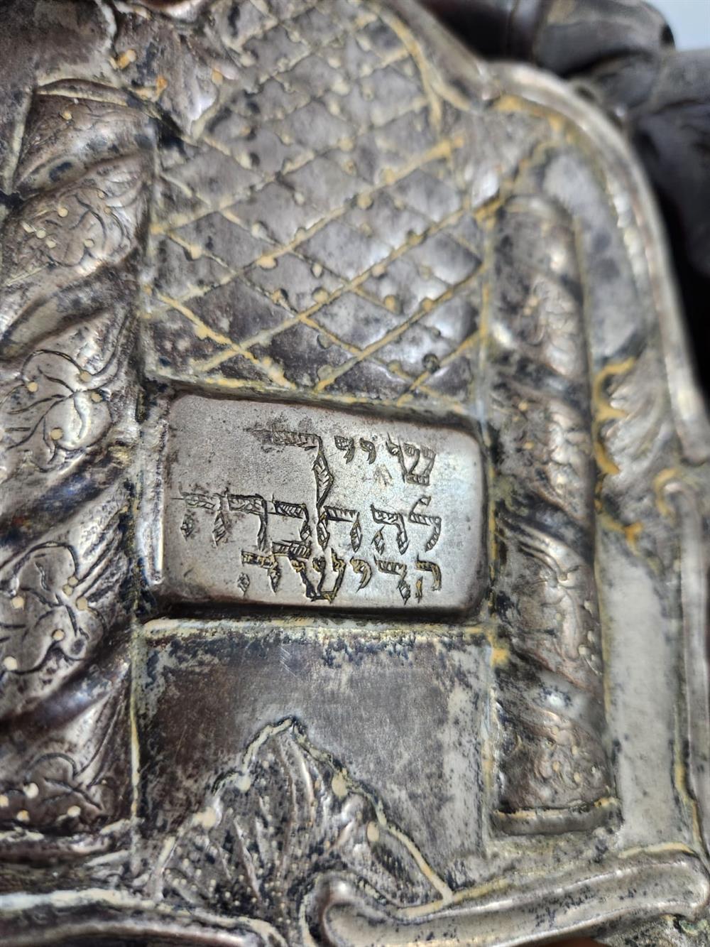 Extremely rare - an antique German Torah scroll plaque (Shield) from the 18th century, made of '800' silver, unsigned, the purity of the silver tested, hand-hammered from the German Rococo period and style, bearing on its front the inscription: 'Belongs to a holy community' [of a holy community].
