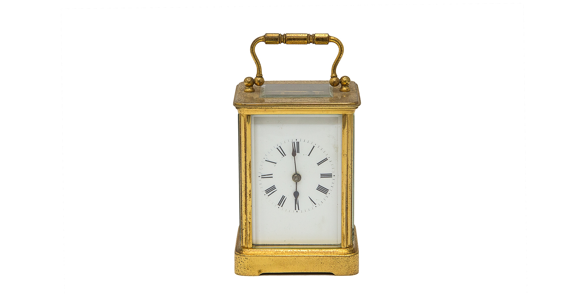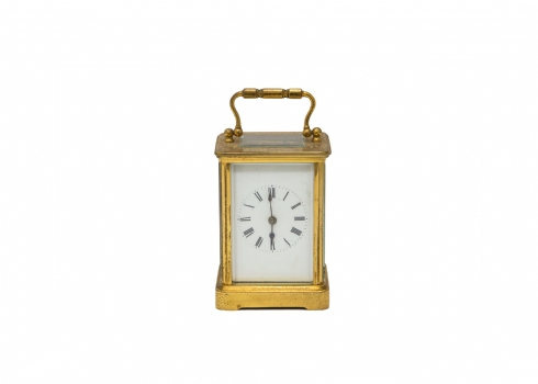 שעון נשיאה עתיק מסוג: 'Carriage Clock', גוף השעון עשוי פליז וקריסטל, גובה כולל ידית נשיאה: 14.5 ס"מ.