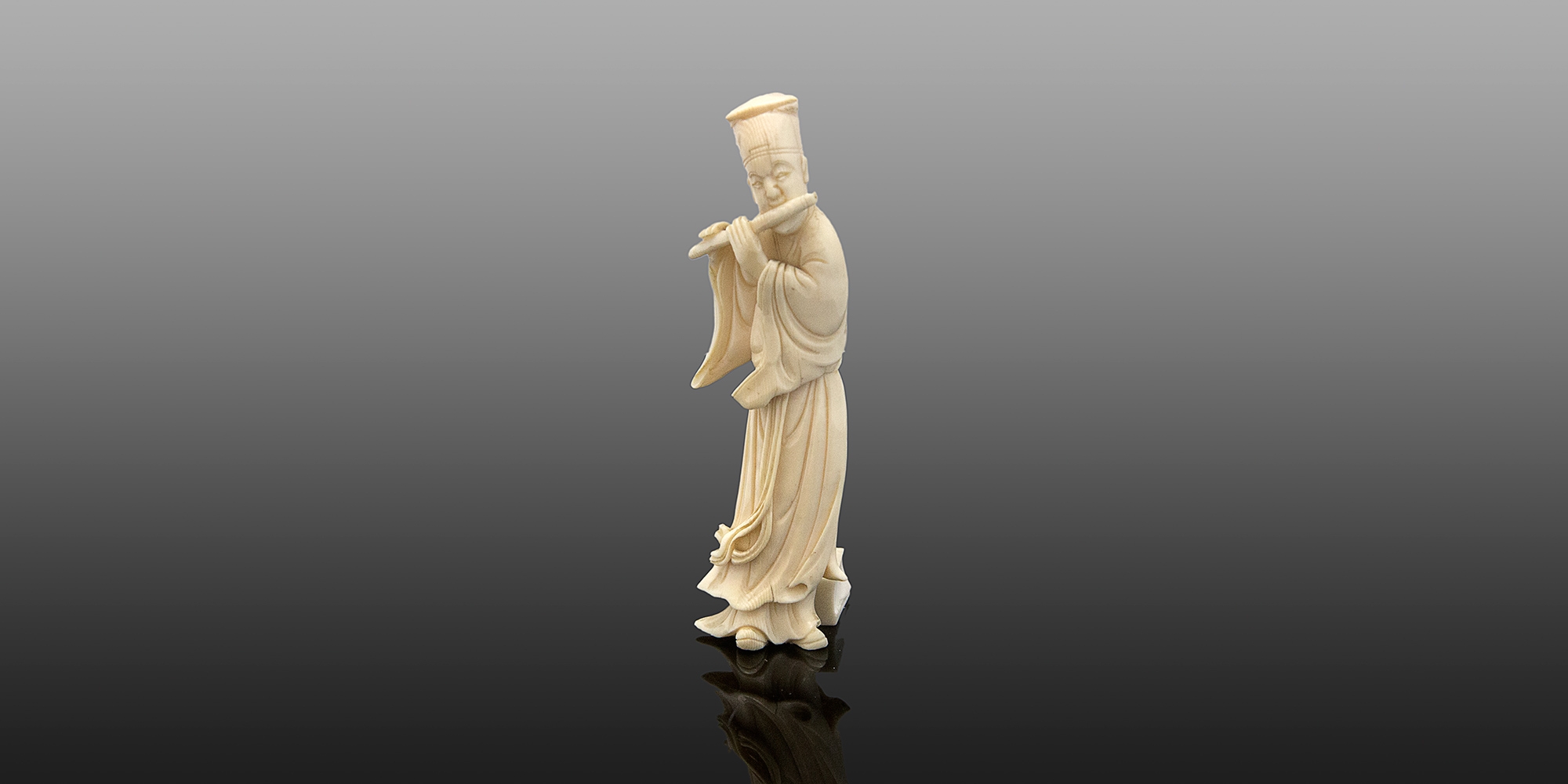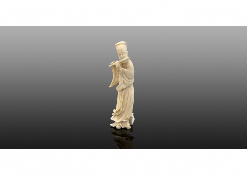 פסלון שנהב סיני עתיק עשוי שן פיל מגולפת בעבודת יד אמן, גובה: 13 ס"מ.