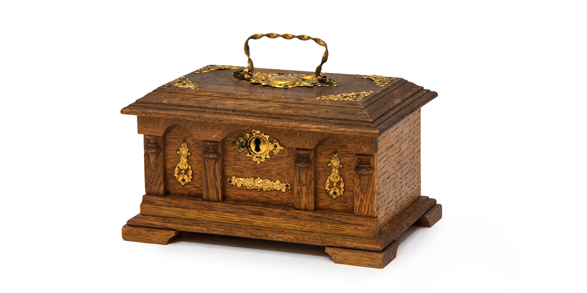 קופסת תכשיטים ישנה עשוי עץ מעוטרת מתכת. אורך: 16.5 ס"מ.