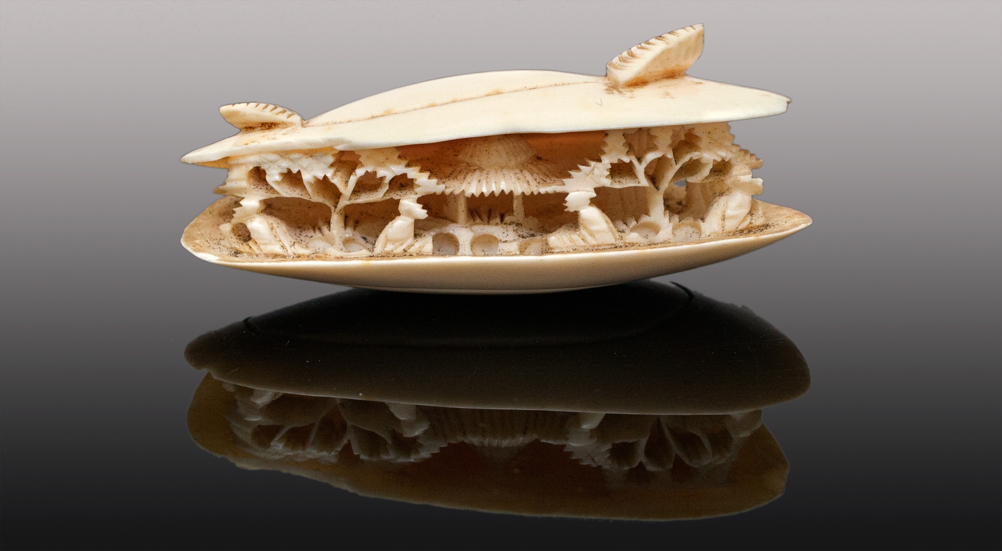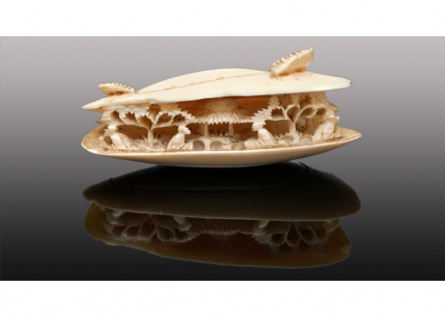 דגם שנהב (שן פיל) בדמות אנשים בתוך קונכייה, אורך: 5.5 ס"מ.