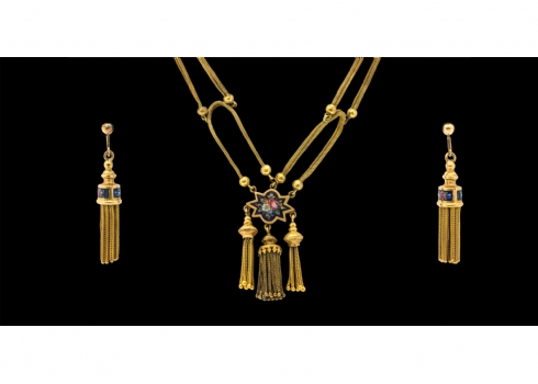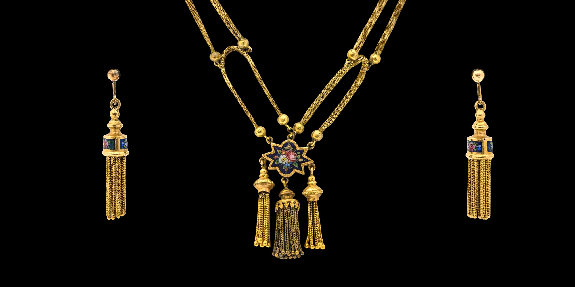 מספר הפריט בקטלוג 225סט תכשיטים (ענק וזוג עגילים) עשוי זהב 14 קארט (לא חתום, אולם נבדק פעמיים עם חומצה), גדיל אחד כפי הנראה לא זהב, מעוטר ציורי יד באמייל פוליכרום, משקל כולל: 39.05 גרם סה"כ.