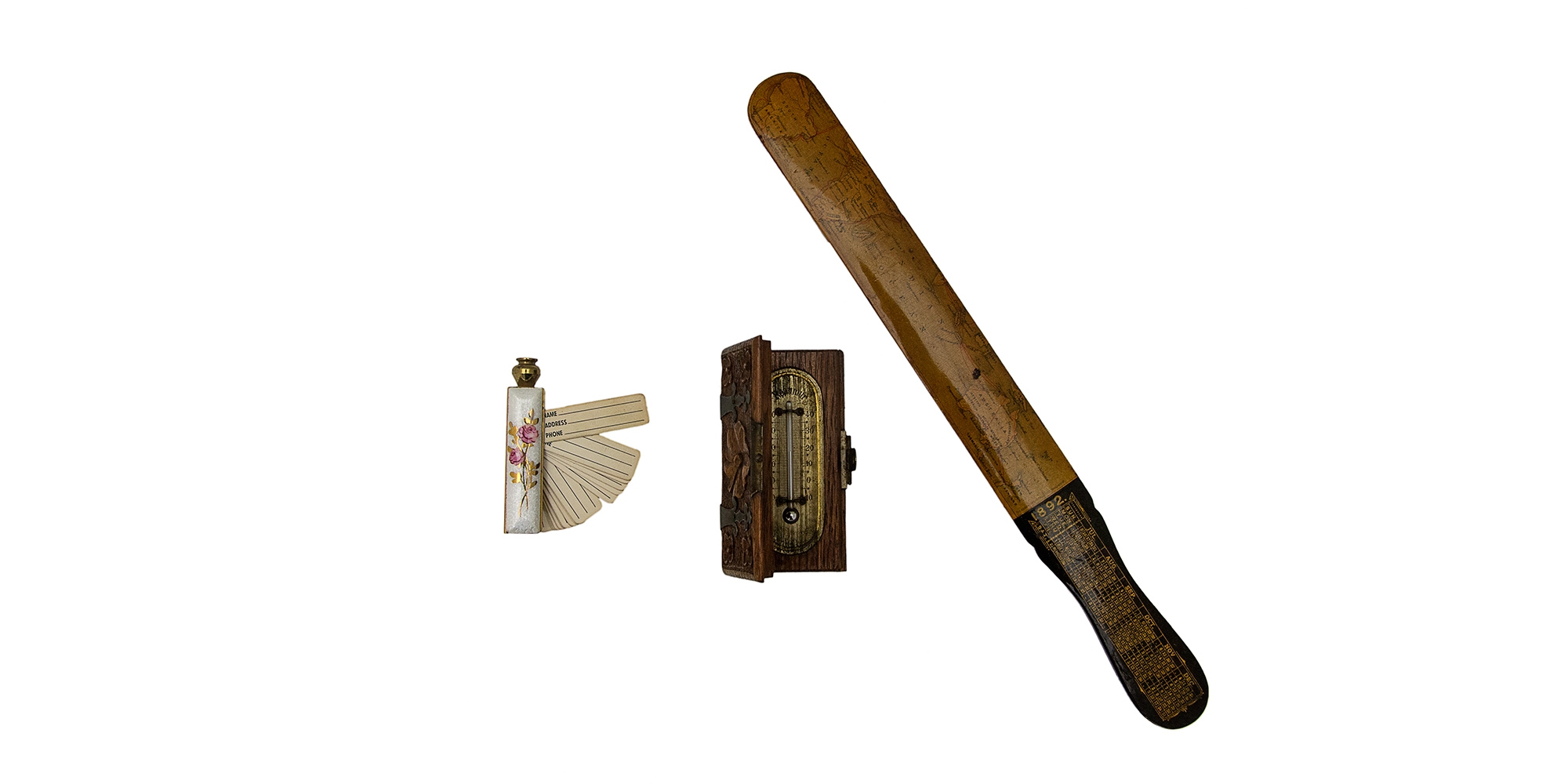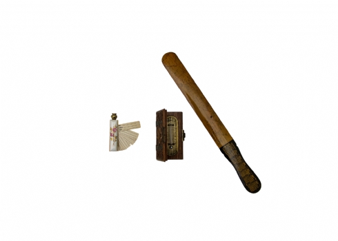 לוט של שלושה פריטים למשרד הכולל, מד חום, מתקן כתובות ישן ומקל להעברת דפים באורך: 33 ס"מ.