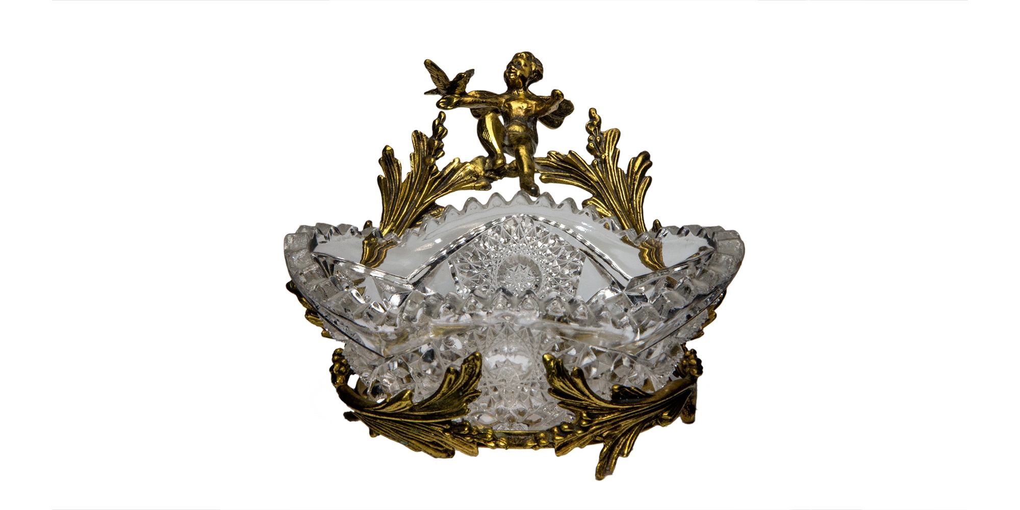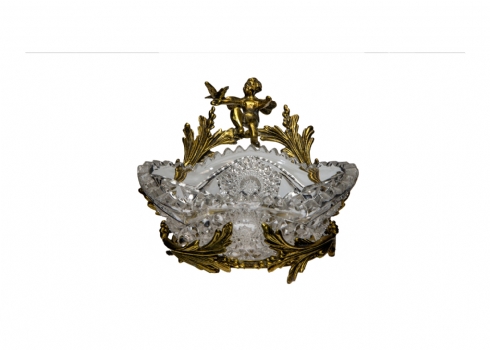 כלי שולחני ישן בסגנון עתיק, עשוי פליז מפוסל בדמות מלאך וציפור, בתוכו כלי נשלף (Liner) קריסטל מלוטש, רוחב: 17 ס"מ.