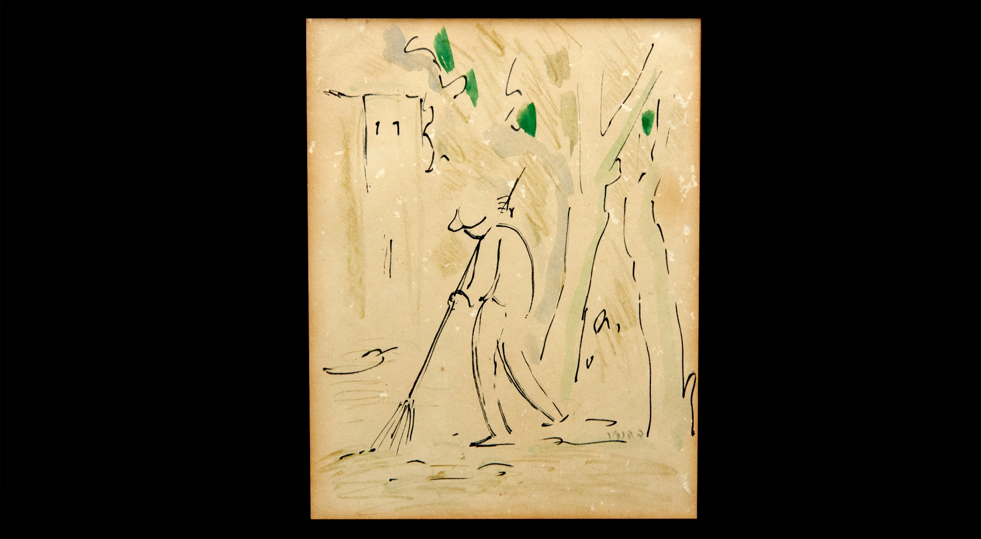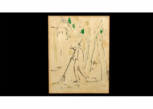 מספר הפריט בקטלוג 279'גנן גורף עלים' - רישום ואקוורל על נייר, חתום, מידות: 22X17 ס"מ.