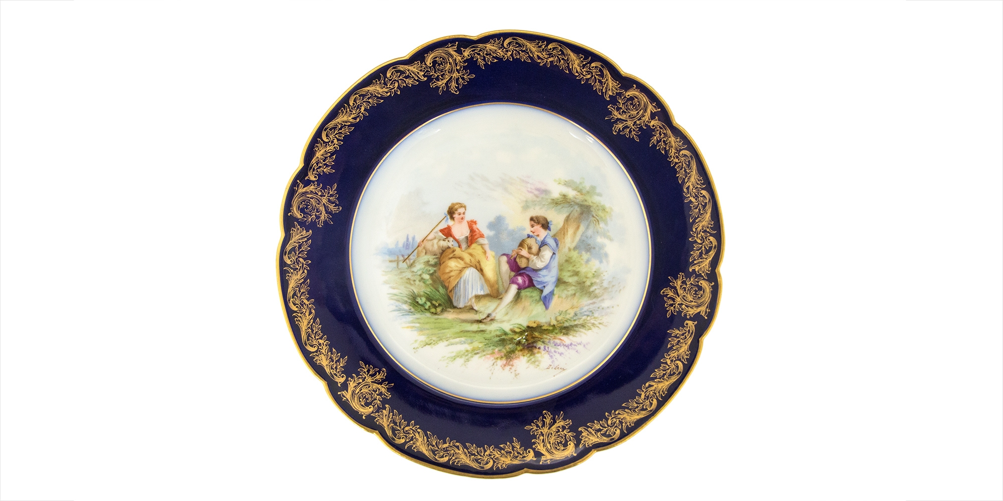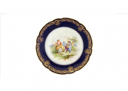 מספר הפריט בקטלוג 85צלחת פורצלן צרפתית ישנה בסגנון 'סוורה', חתומה: 'Sevres', מעוטרת בהדפס של זוג באחו מוריק ובזהב על רקע אימרת קובלט כחול, המאה העשרים, קוטר: 24.2 ס"מ.