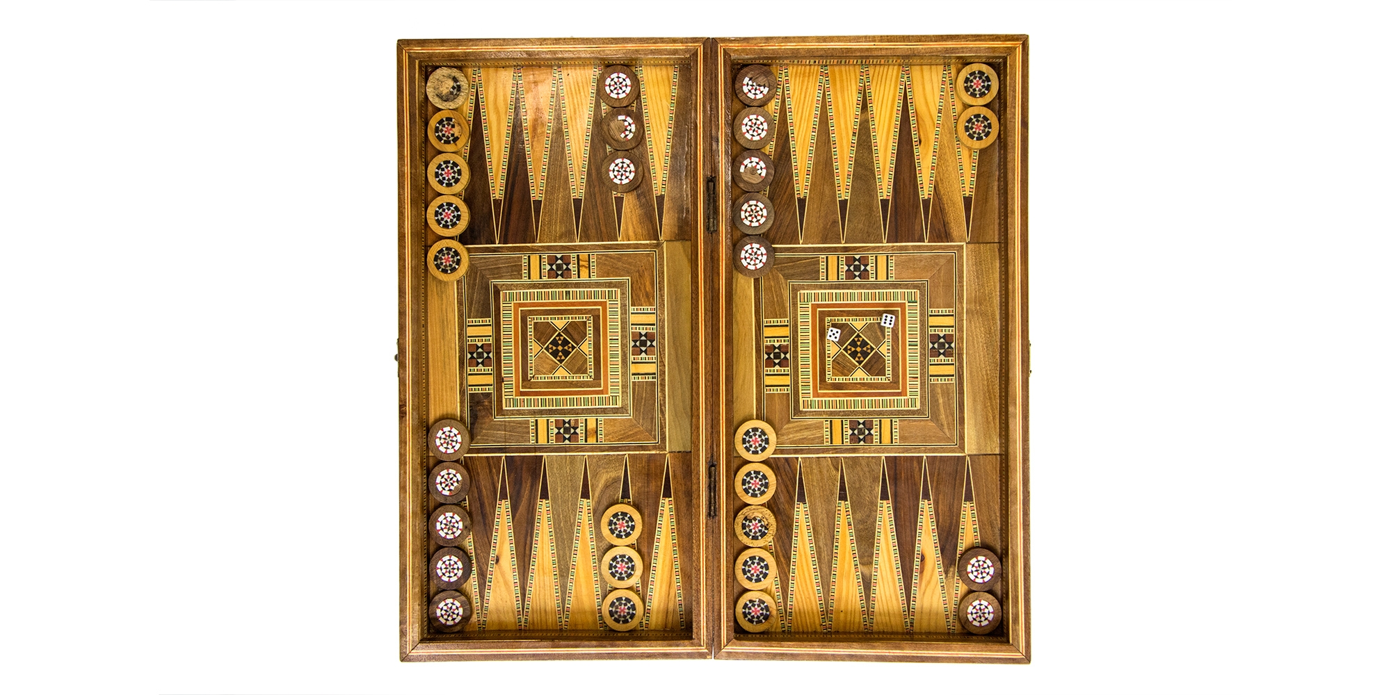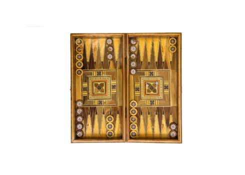 משחק ששבש מעץ הכולל קופסה משובץ בעבודת פרקטרי, וכלי משחק, אורך הקופסה: 49 ס"מ.