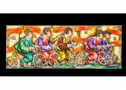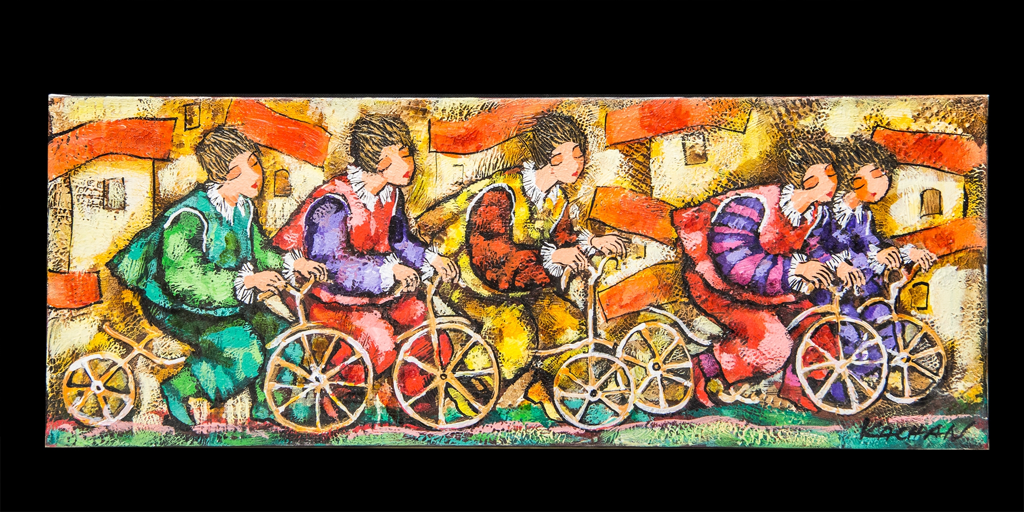 מיכאל קצ'אן - 'רוכבות האופניים', אקריליק על בד, חתום, מידות: 30X80 ס"מ.