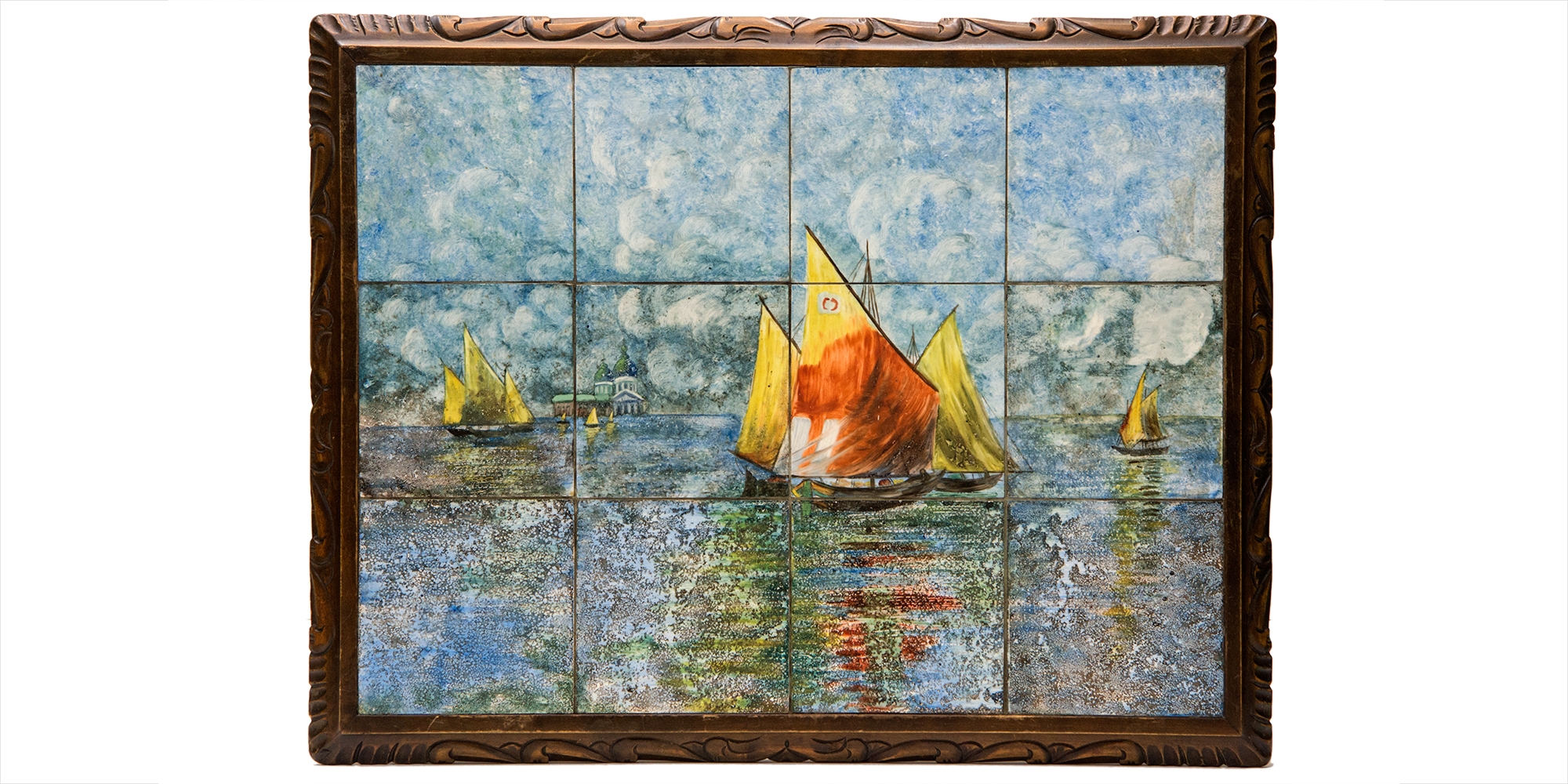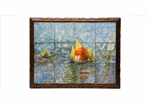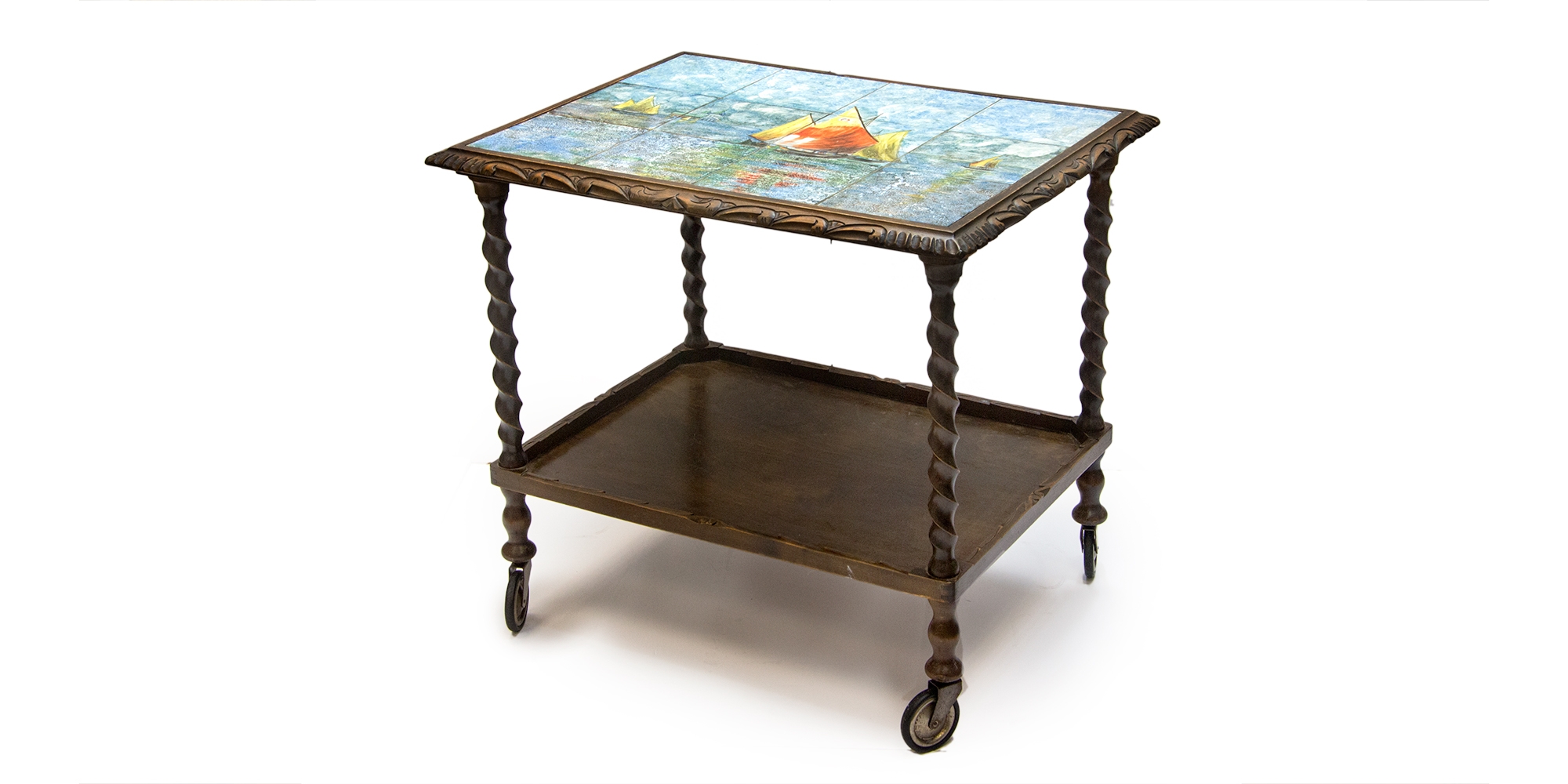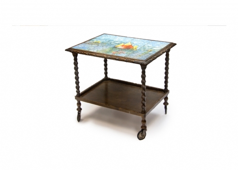שולחן קפה ישן עשוי עץ, המשטח העליון משובץ אריחי חרסינה מעוטרים ציורי יד באמייל פוליכרום, גובה: 63 ס"מ, אורך: 70 ס"מ, רוחב: 52 ס"מ.