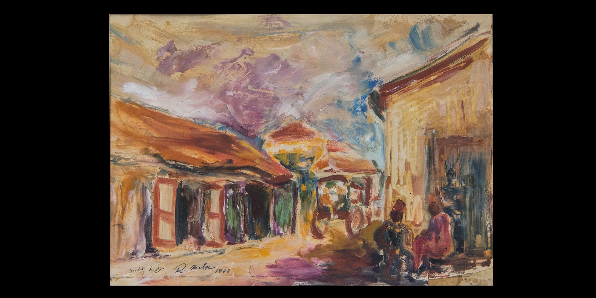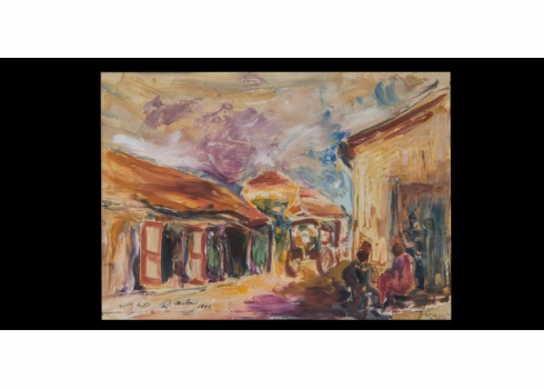 מספר הפריט בקטלוג 699רפאל מוהר - 'רחוב', שמן על נייר, חתום ומתוארך: 1943, פגם וחוסר, מידות: 24.5X34 ס"מ.