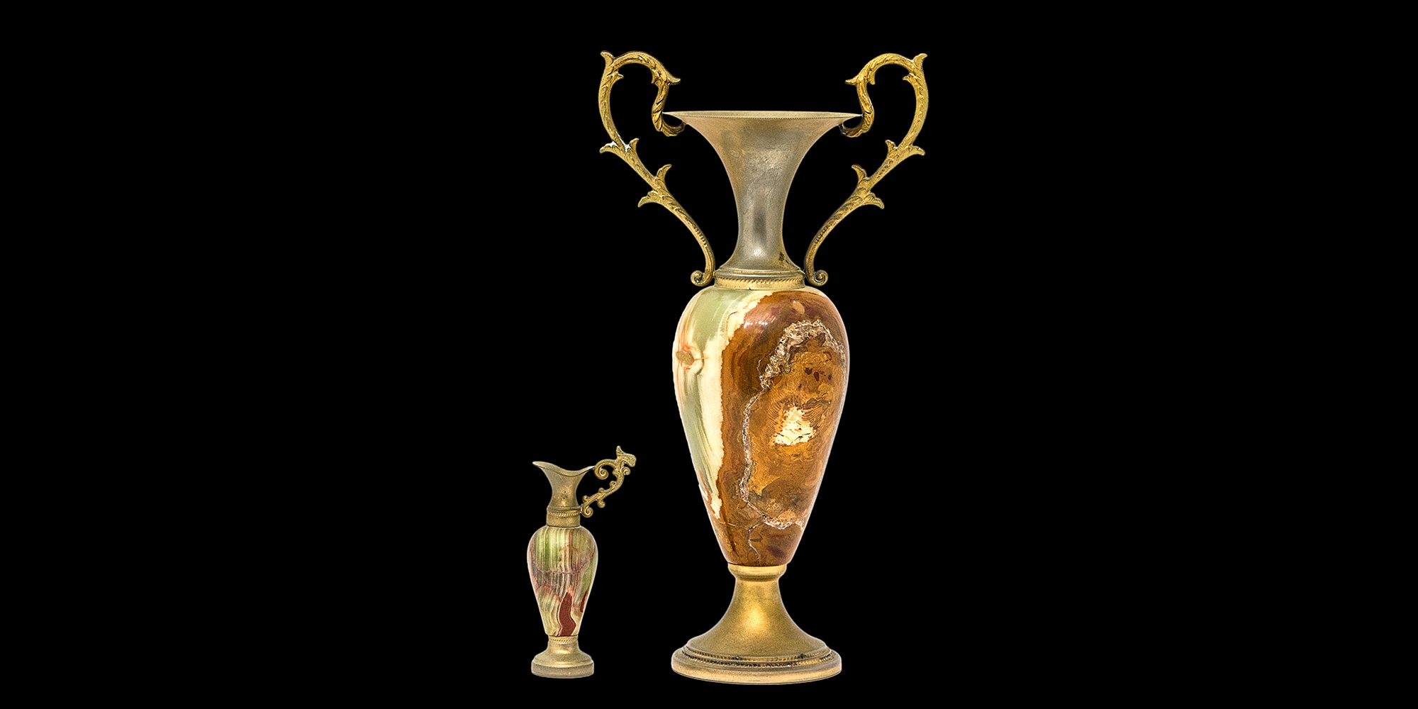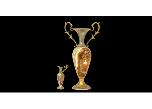 לוט של שני אגרטלים, גוף האגרטל עשוי אוניקס, התקני מתחת צבועים זהב, גובה הגבוה מהם כולל ידיות: 34 ס"מ.