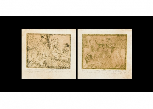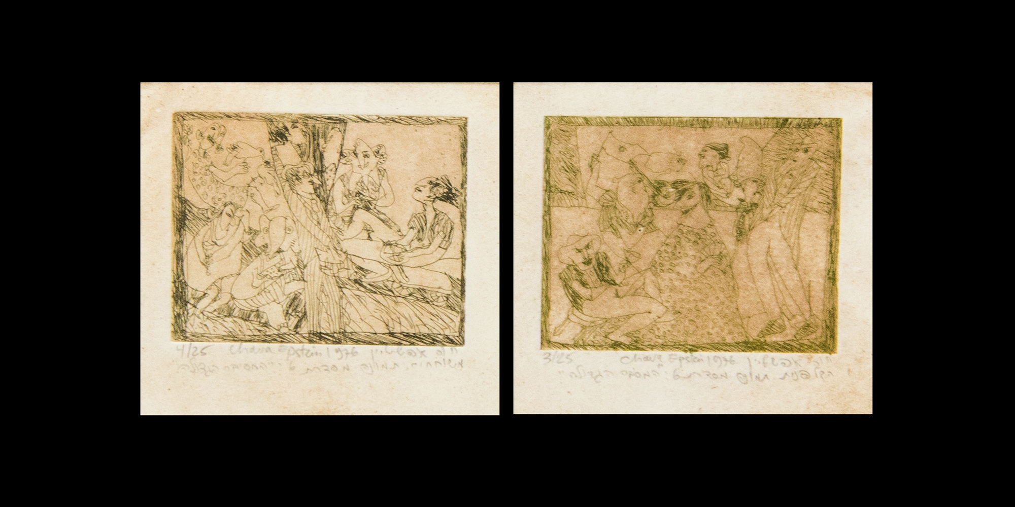 זוג תצריבים ישנים של חווה אפשטיין, חתום, מתוארך - 1976, מידות: 10X10 ס"מ.