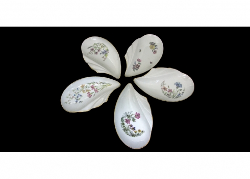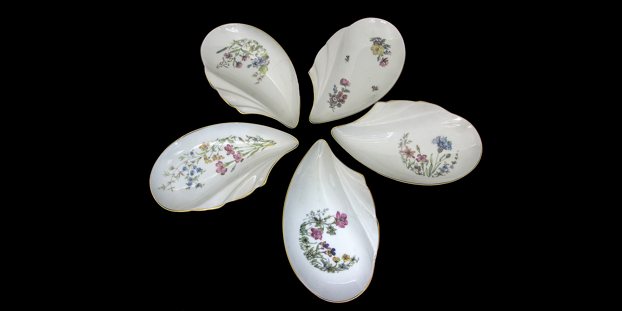 מספר הפריט בקטלוג 547חמישה כלי הגשה גרמנים ישנים, מתוצרת 'הוטשנרוייטר' ('Hutschenreuther'), מעוטרים באמייל פוליכרום, חתומים, אורך: 22 ס"מ.