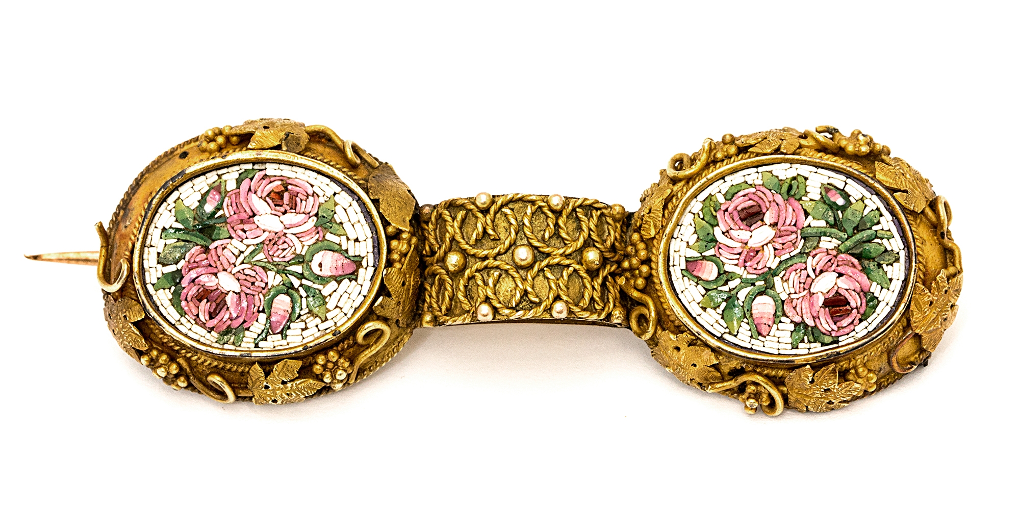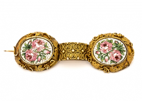 מספר הפריט בקטלוג 755מציאה - סיכה איטלקית עתיקה עשויה זהב 10 קארט, משובצת שני מדליוני 'מיקרומוזאיקה' (micromosaic) בדגם שושנים פורחות, המאה ה-19, דגם נדיר, אורך: 6 ס"מ.