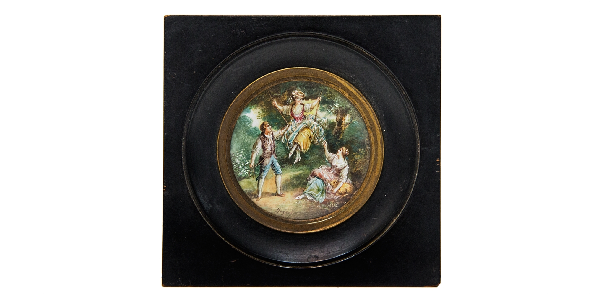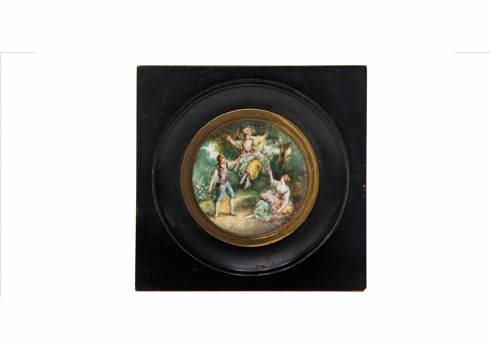 מספר הפריט בקטלוג 767לאספני מניאטורות - מניאטורה עתיקה, יפה ואיכותית, מצויירת ביד אמן וחתומה על ידו, כפי הנראה מצויירת על לוח שנהב עגול, משנת 1880-1890 בקירוב, רוחב המסגרת עץ: 15 ס"מ.