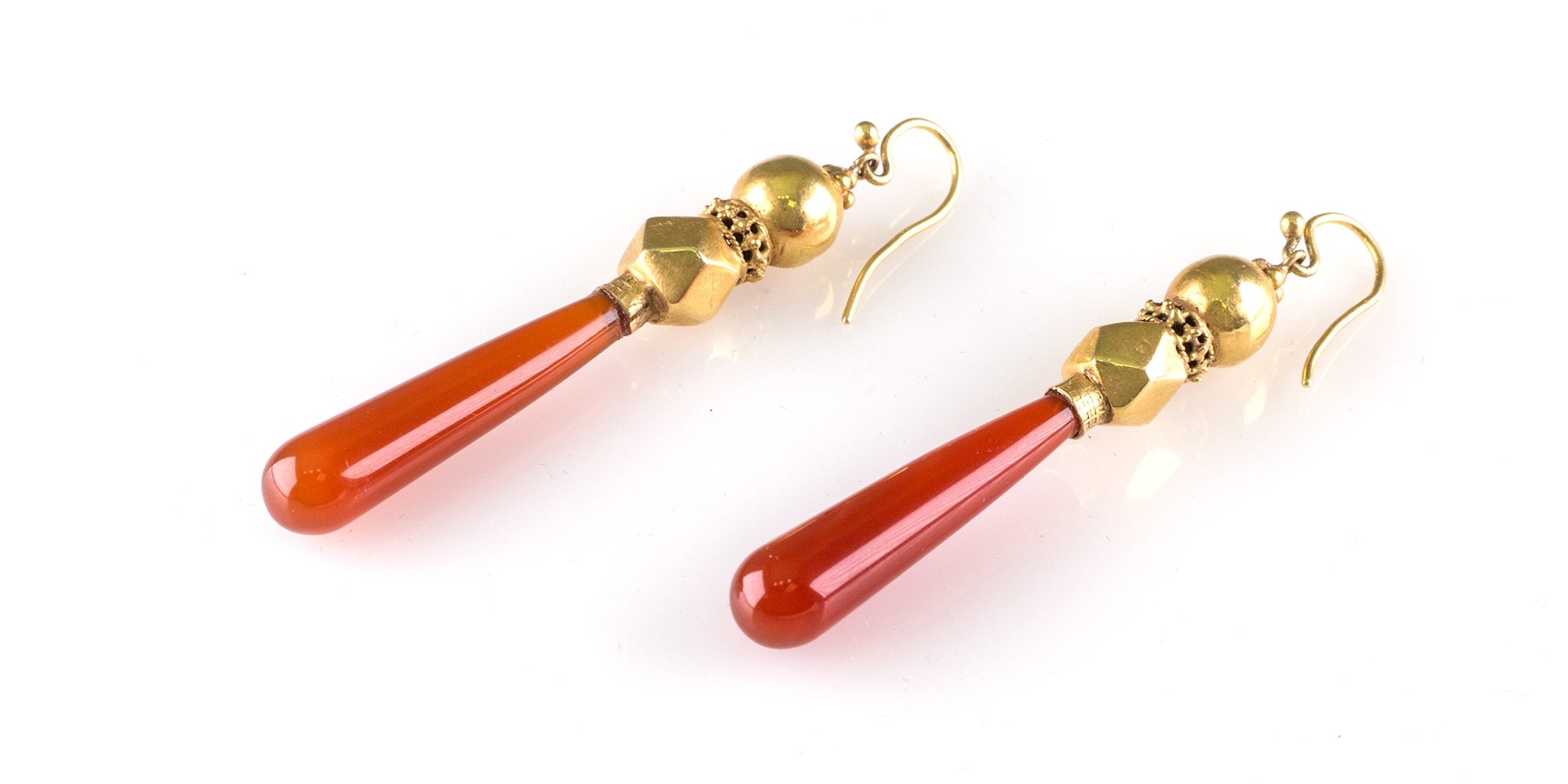 זוג עגילי זהב עתיקים משובצים אבני קורניאול