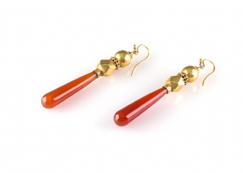 מספר הפריט בקטלוג 213זוג עגילים בוכרים עתיקים עשויים זהב צהוב 18 קראט משובצים אבני קורניאול בליטוש טיפות תולות, אורך: 6.5 ס"מ.