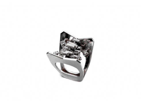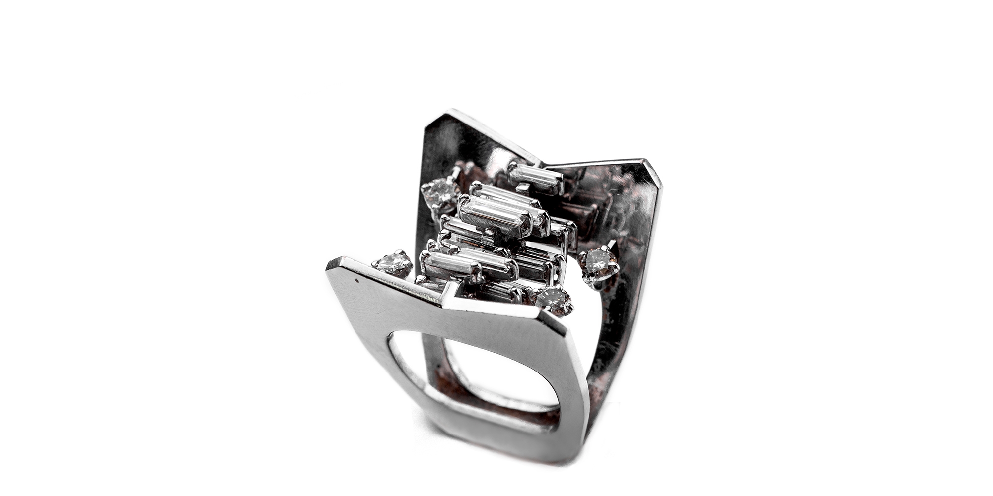 מספר הפריט בקטלוג 198טבעת מעוצבת משנות ה-60, עשויה זהב לבן 14 קארט (משקל כולל: 14.92 גרם), משובצת יהלומים איכותיים בליטושים שונים במשקל כולל של כ: 2 קארט סה"כ.