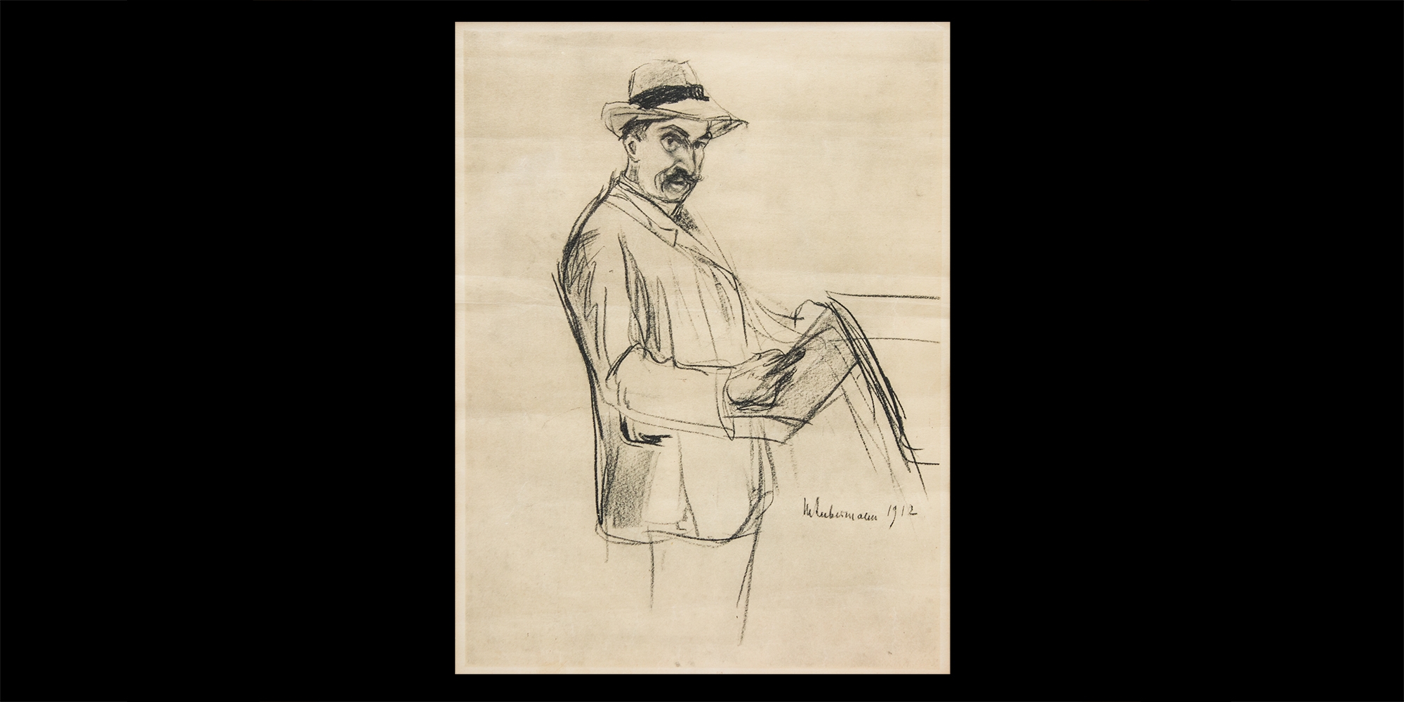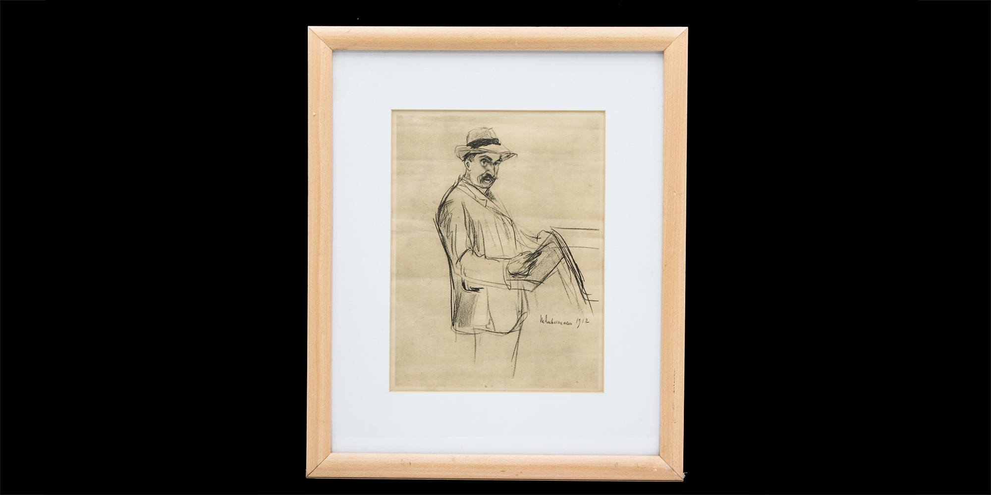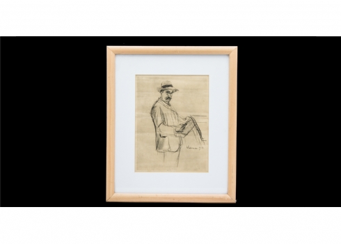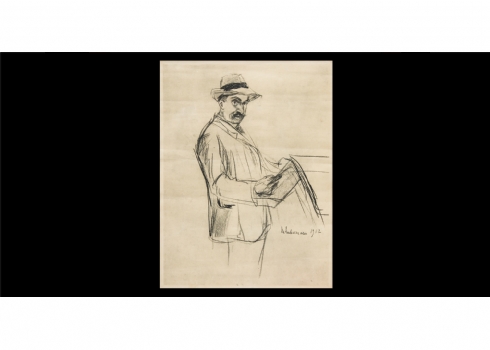 'גבר קורא עיתון' - רישום פחם על נייר, חתום ומתוארך.