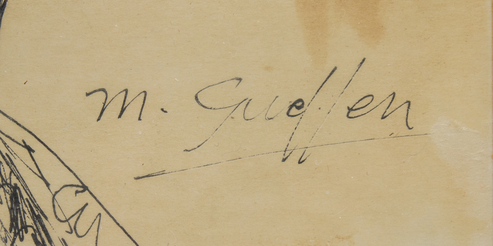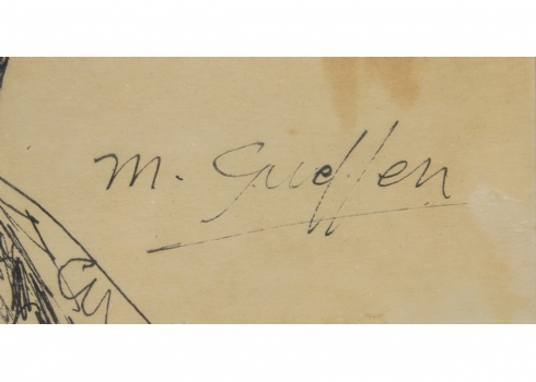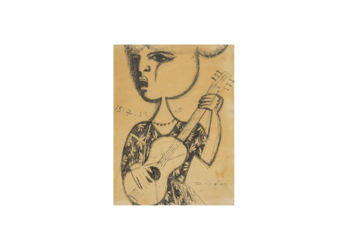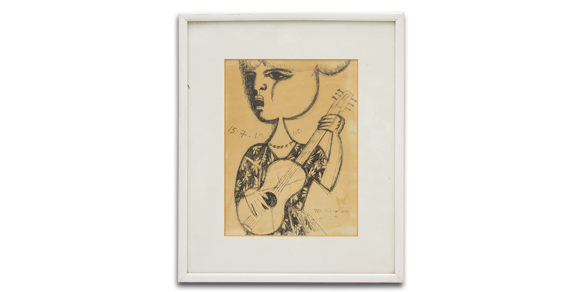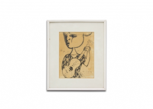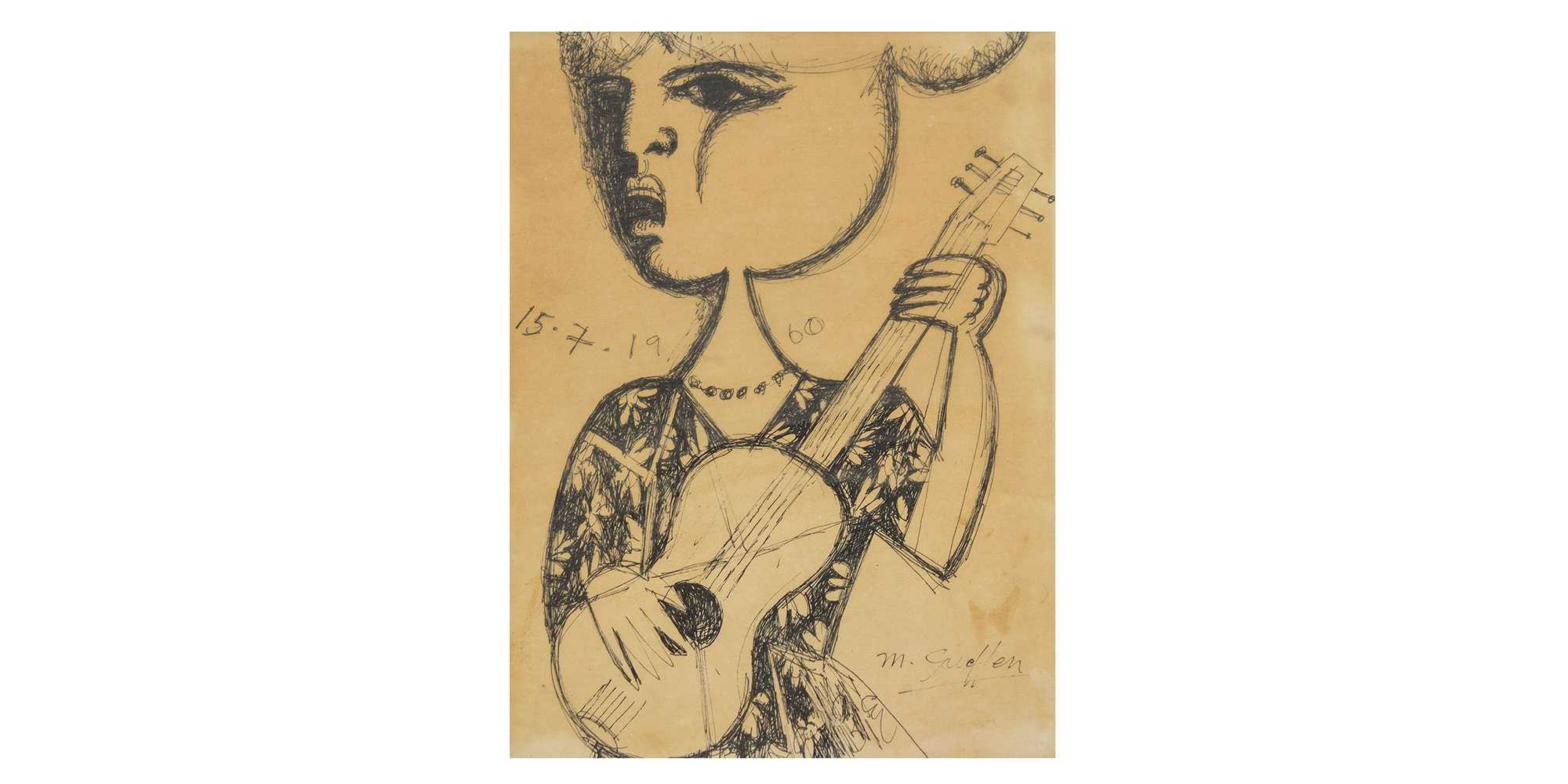 מספר הפריט בקטלוג 61מנחם גפן - 'אישה מנגנת בגיטרה' - רישום דיו על נייר, חתום: 'M. Gueffen' ומתוארך: 1960, מידות: 26X20 ס"מ.
