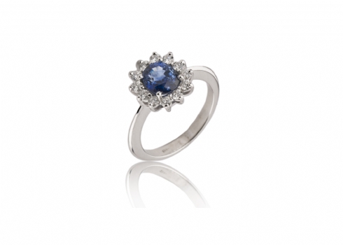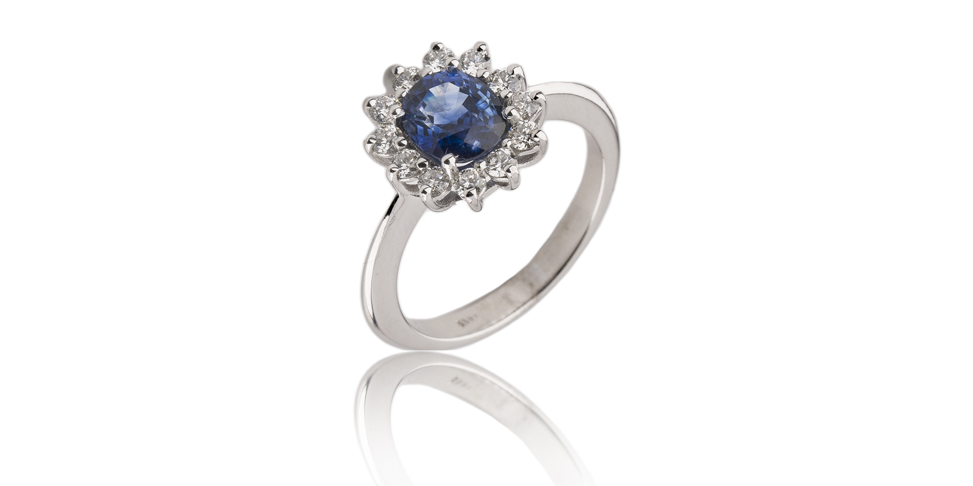 מספר הפריט בקטלוג 269טבעת 'דיאנה' עשויה זהב לבן 18 קארט, משובצת במרכזה ספיר כחול איכותי במשקל של כ: 1.70 קארט ומסביב יהלומים איכותיים במשקל כולל של כ: 48 נקודות סה"כ.