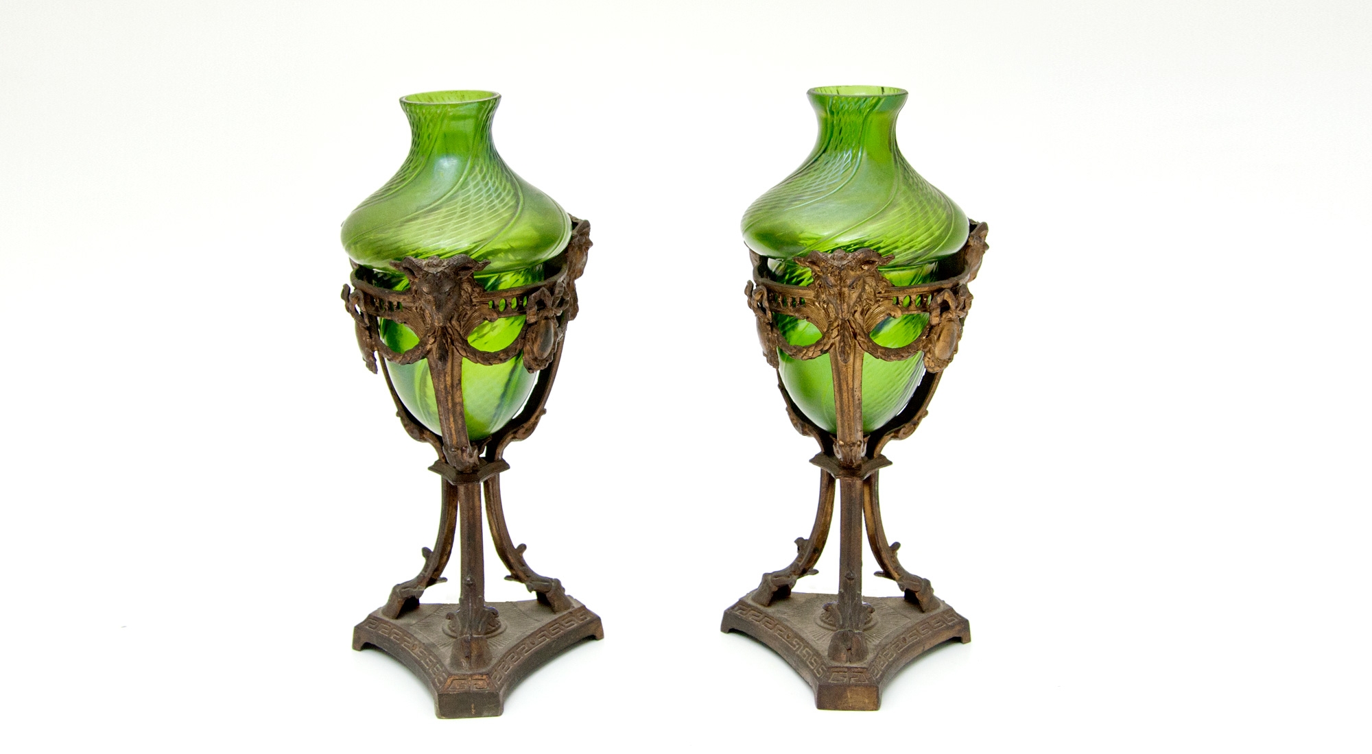 זוג אגרטלים עתיקים מהמאה ה-19, עשויים מתכת (שאריות הזהבה) מעוטרים עיטורי בלט בדמות ראשי איילים וגרלנדות על רגלי טריפוד, בתוכם כדי זכוכית 'אופלסנטית' עשוייה בעבודת ניפוח ידנית, 1880-1890 בקירוב, גובה כולל: 31 ס"מ.