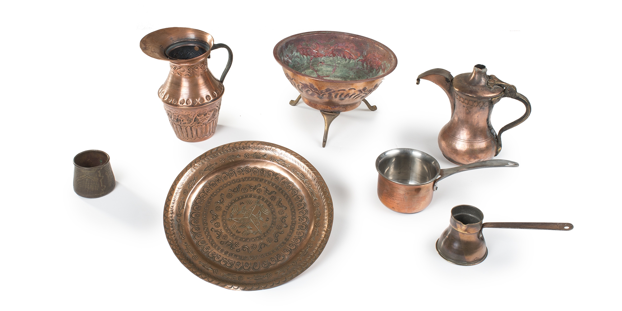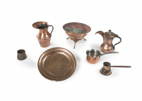 לוט של כלי מתכת שונים, פגם, גובה: 28 ס"מ.