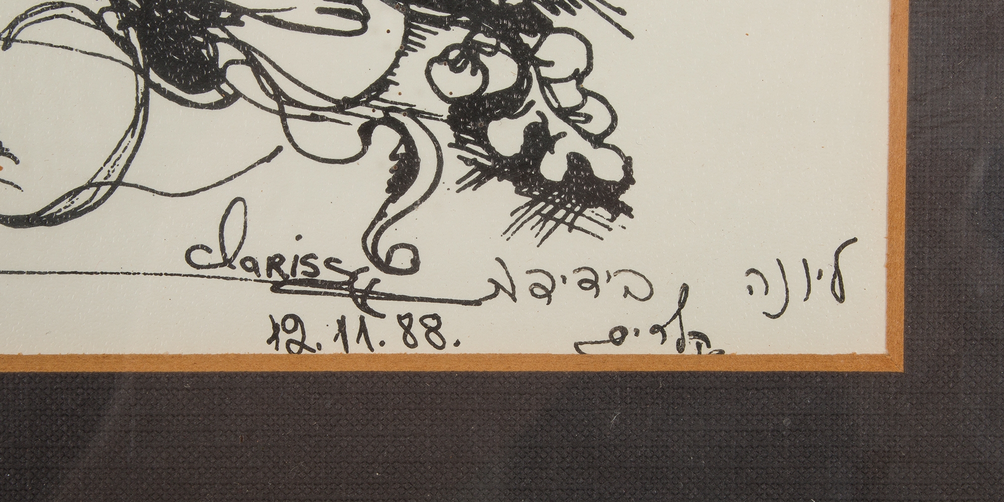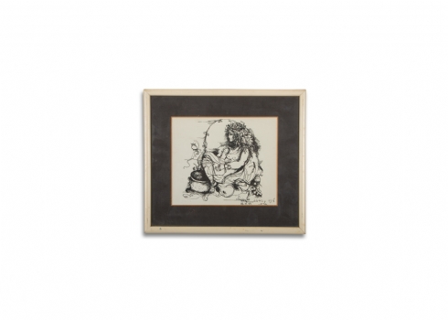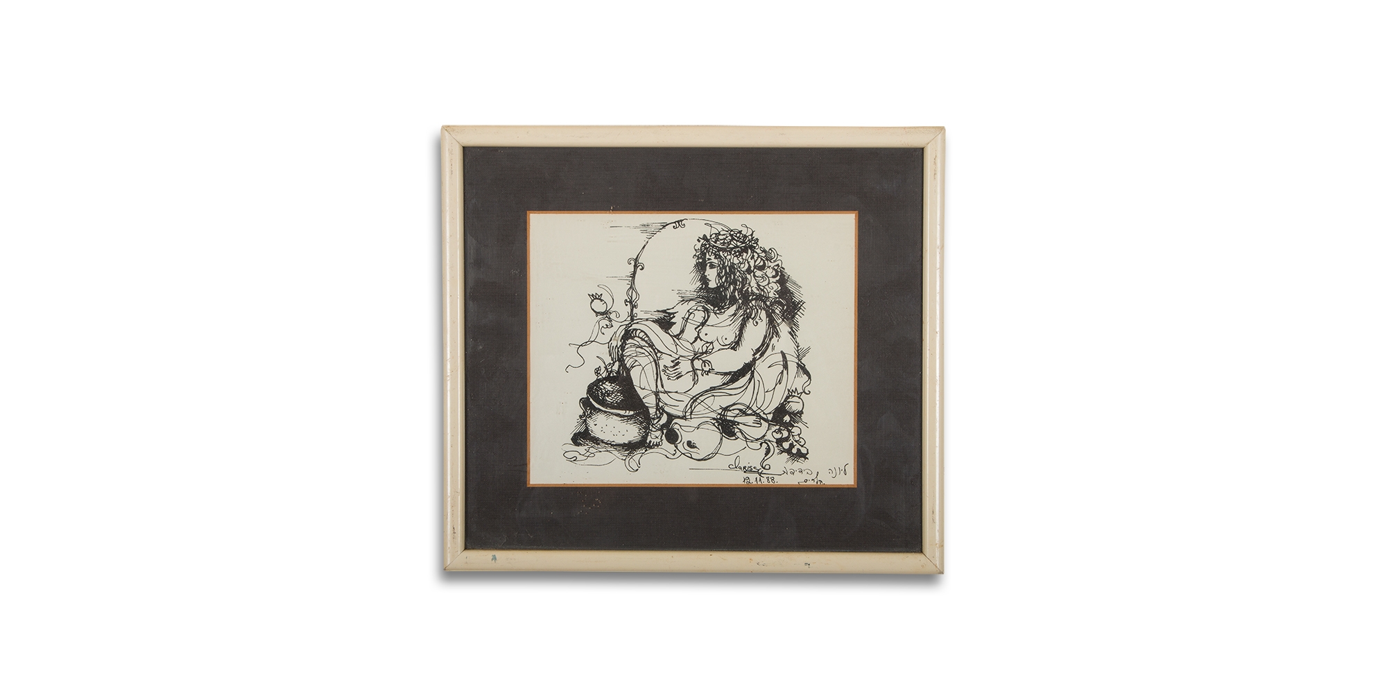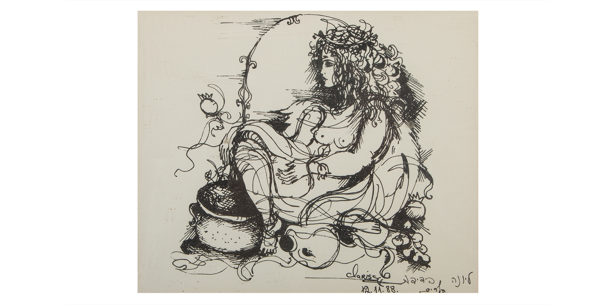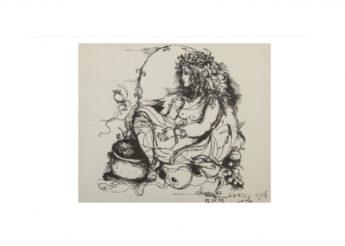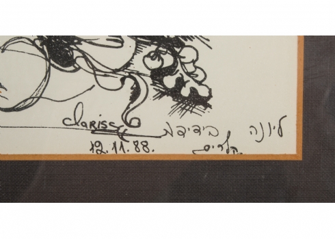 'אישה חשופת חזה', רישום דיו על נייר, חתום ונושא הקדשה, מתוארך - 1988, מידות: 17X20 ס"מ.