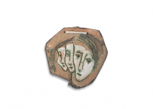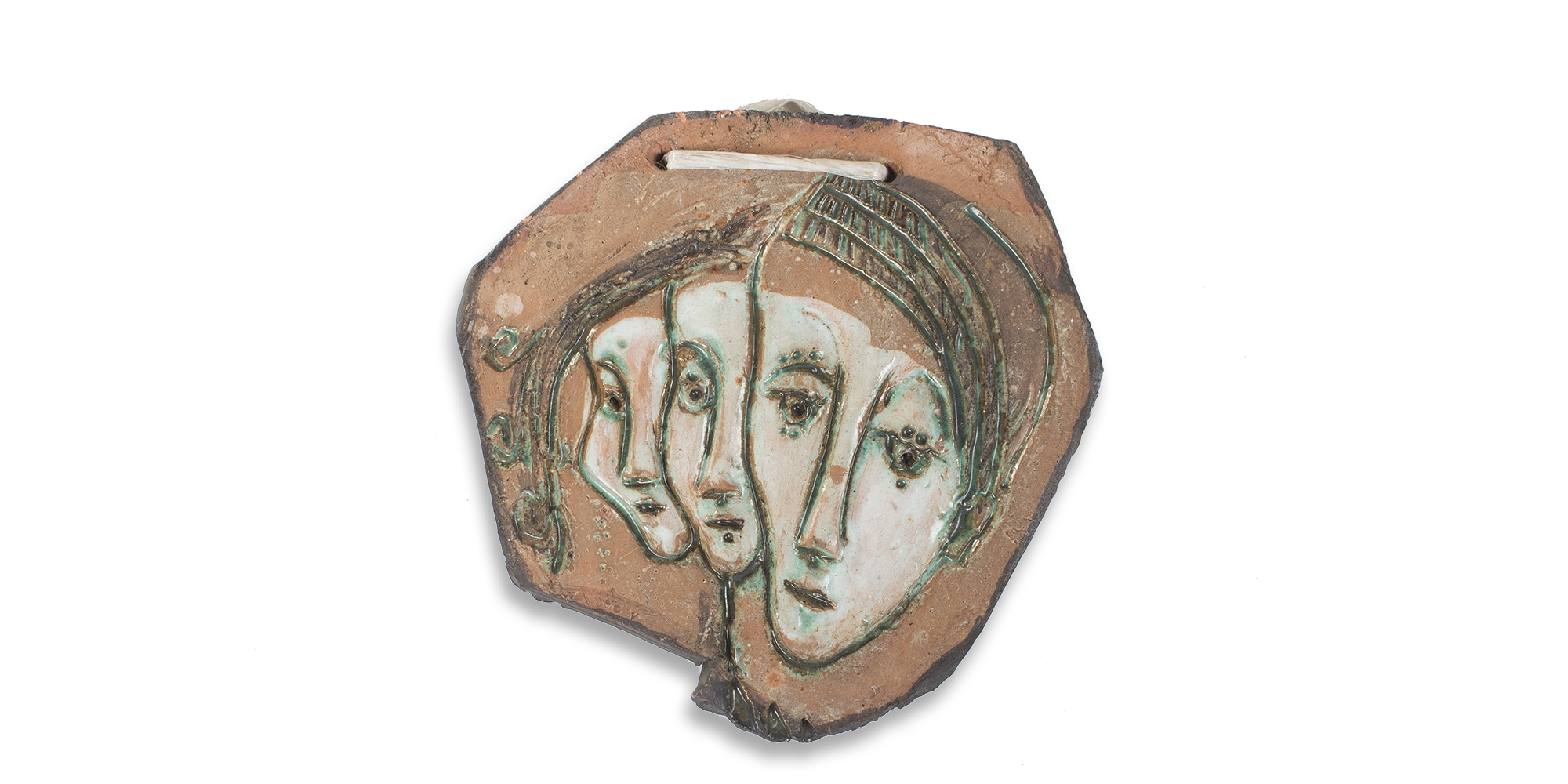 תבליט קרמיקה ישראלי ישן מעוטר בראשי נשים, חתום: 'מגנס', רוחב: 18 ס"מ.