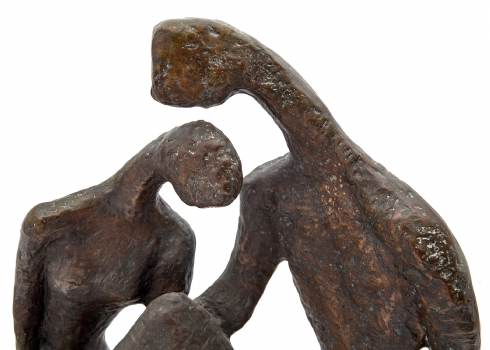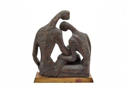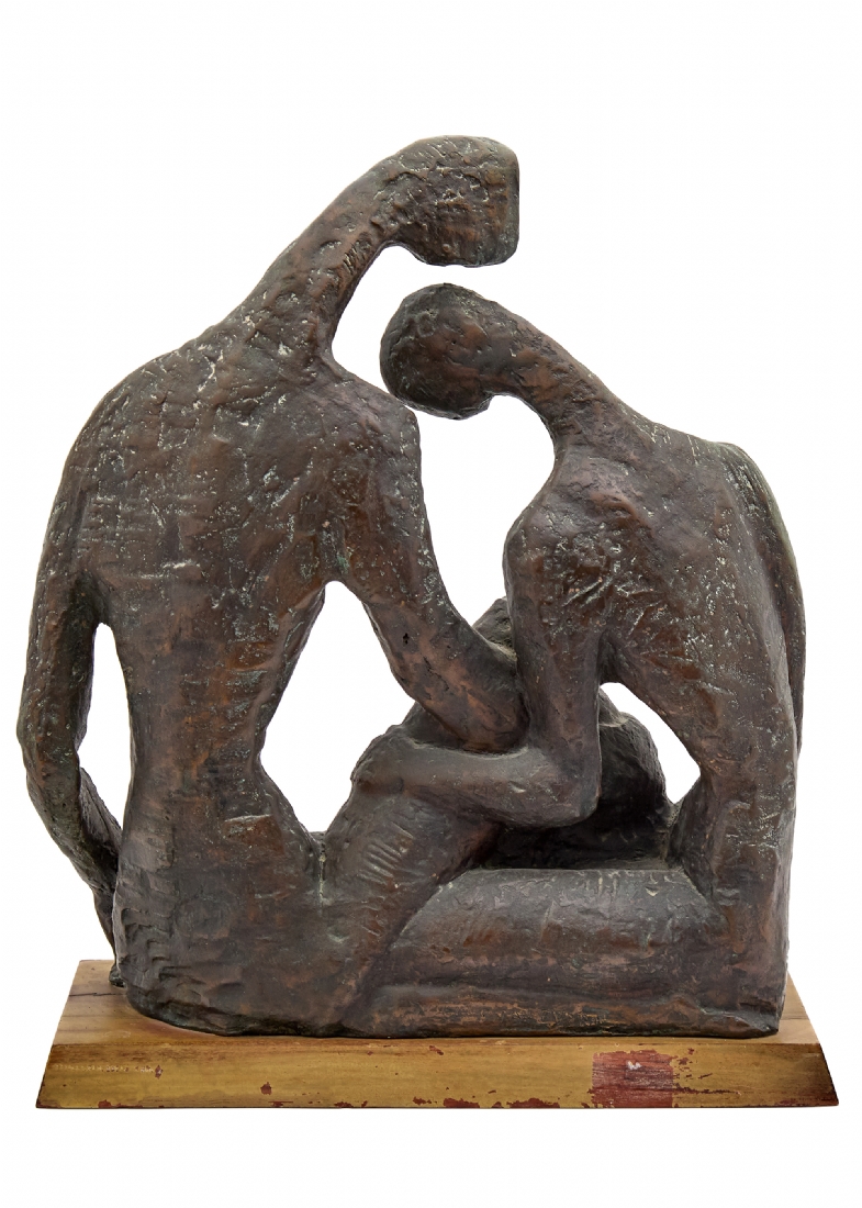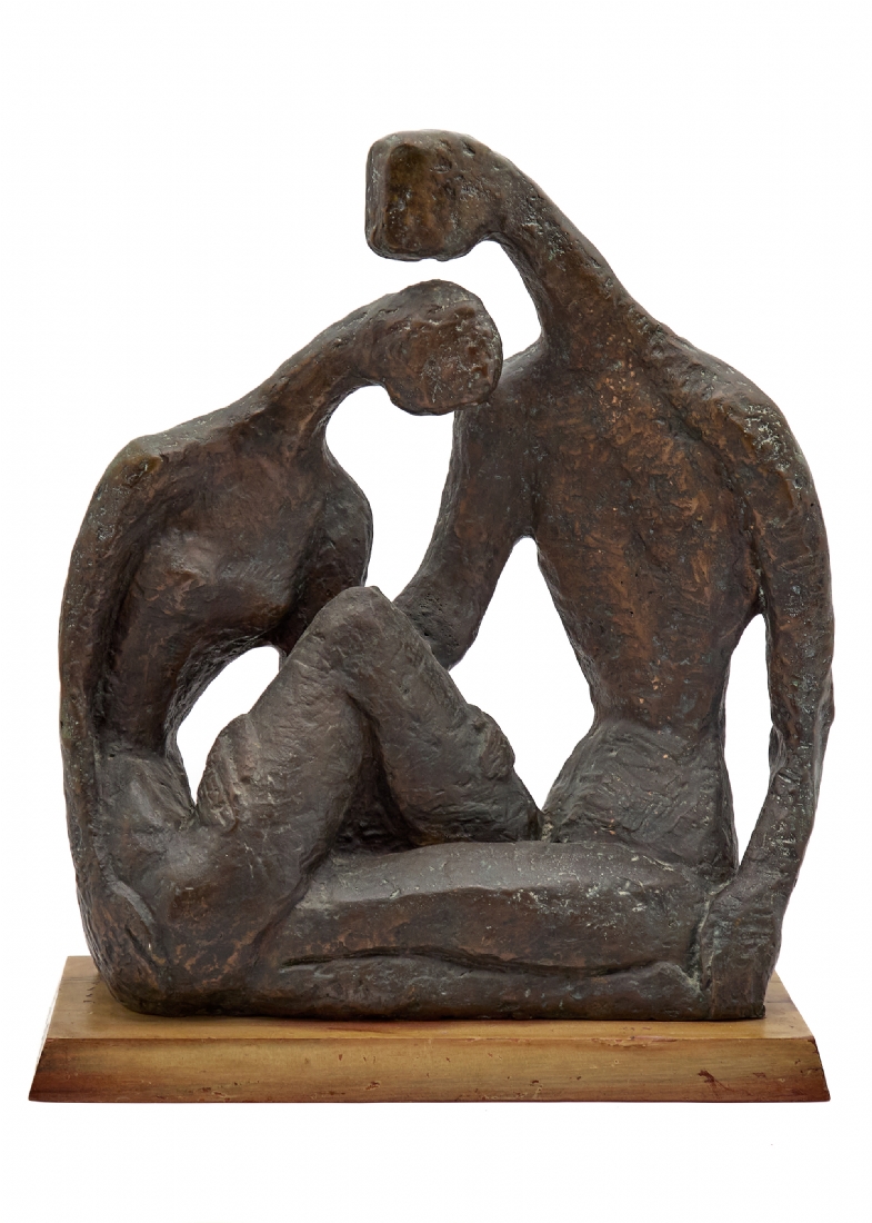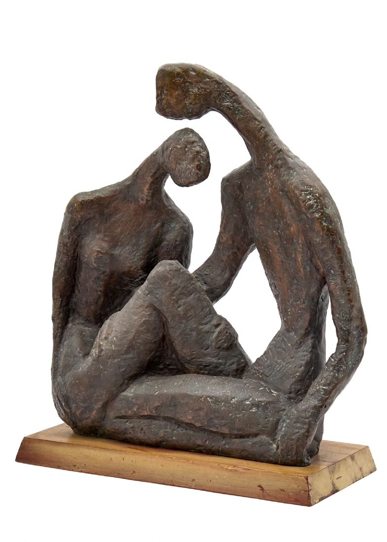 יעל שלו - 'זוג אוהבים', פסל גדול עשוי ברונזה בפטינה חומה, בסיס עץ, חתום