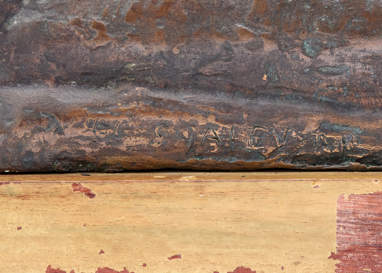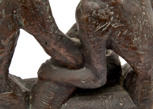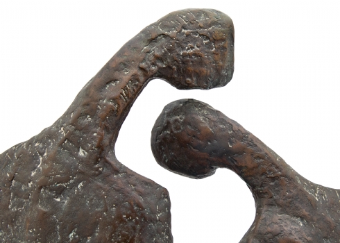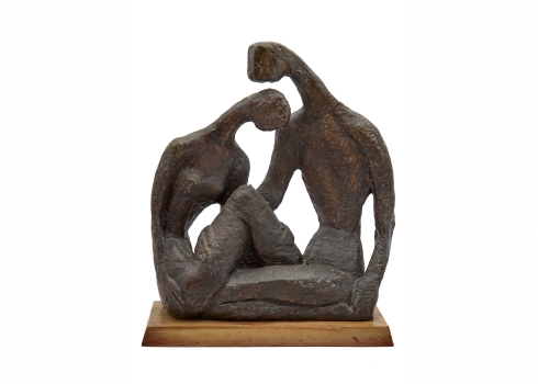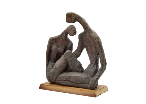 מספר הפריט בקטלוג 395יעל שלו - 'זוג אוהבים', פסל גדול עשוי ברונזה בפטינה חומה, בסיס עץ, חתום, גובה כולל בסיס: 48 ס"מ, אורך הבסיס: 40 ס"מ.