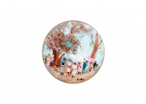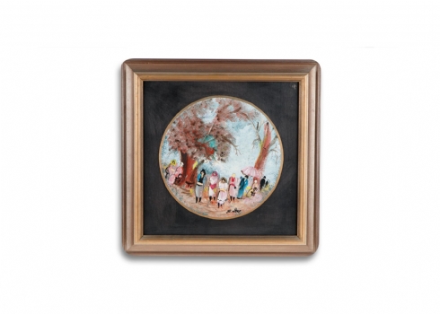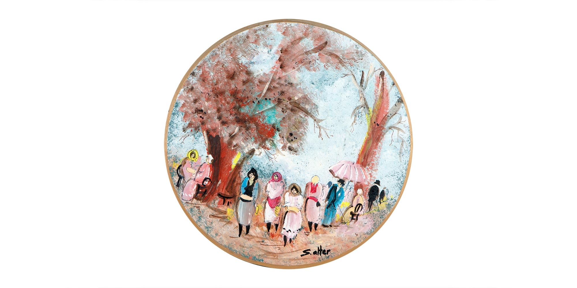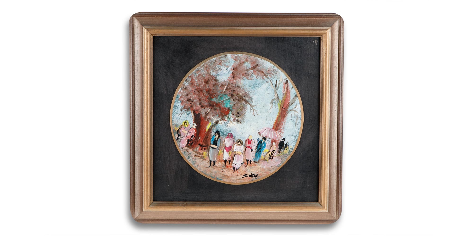 מספר הפריט בקטלוג 5שלמה אלטר - 'אירוע בשדה', שמן ודיון על לוח עגול ממוסגר, חתום, מידות: 37X37 ס"מ.