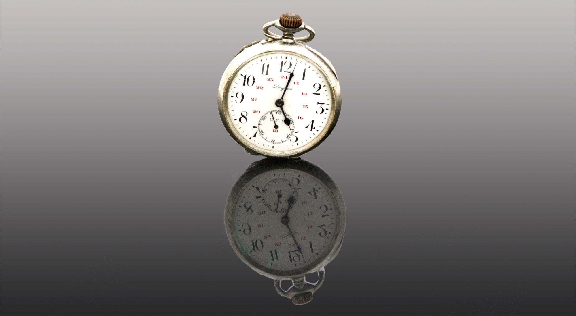 שעון יד ישן, מתוצרת 'LONGINES' שוויץ, עשוי מתכת, גב השעון מעוטר בחריטת יד אמן בדוגמת קטר רכבת, פגם.