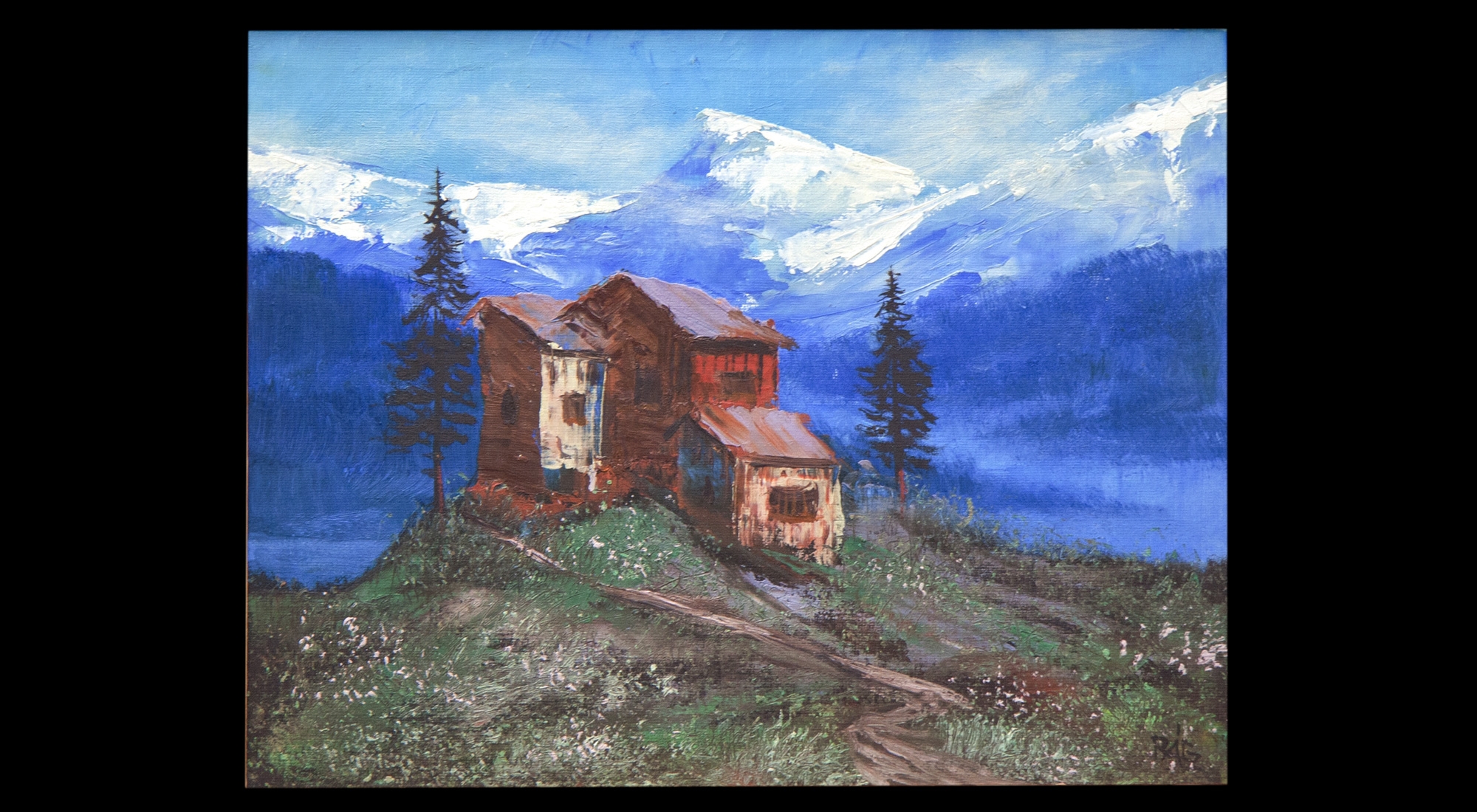 'בית קטן על ההרים' - ציור ישן, שמן על בד, חתום, מידות: 32X40 ס"מ.
