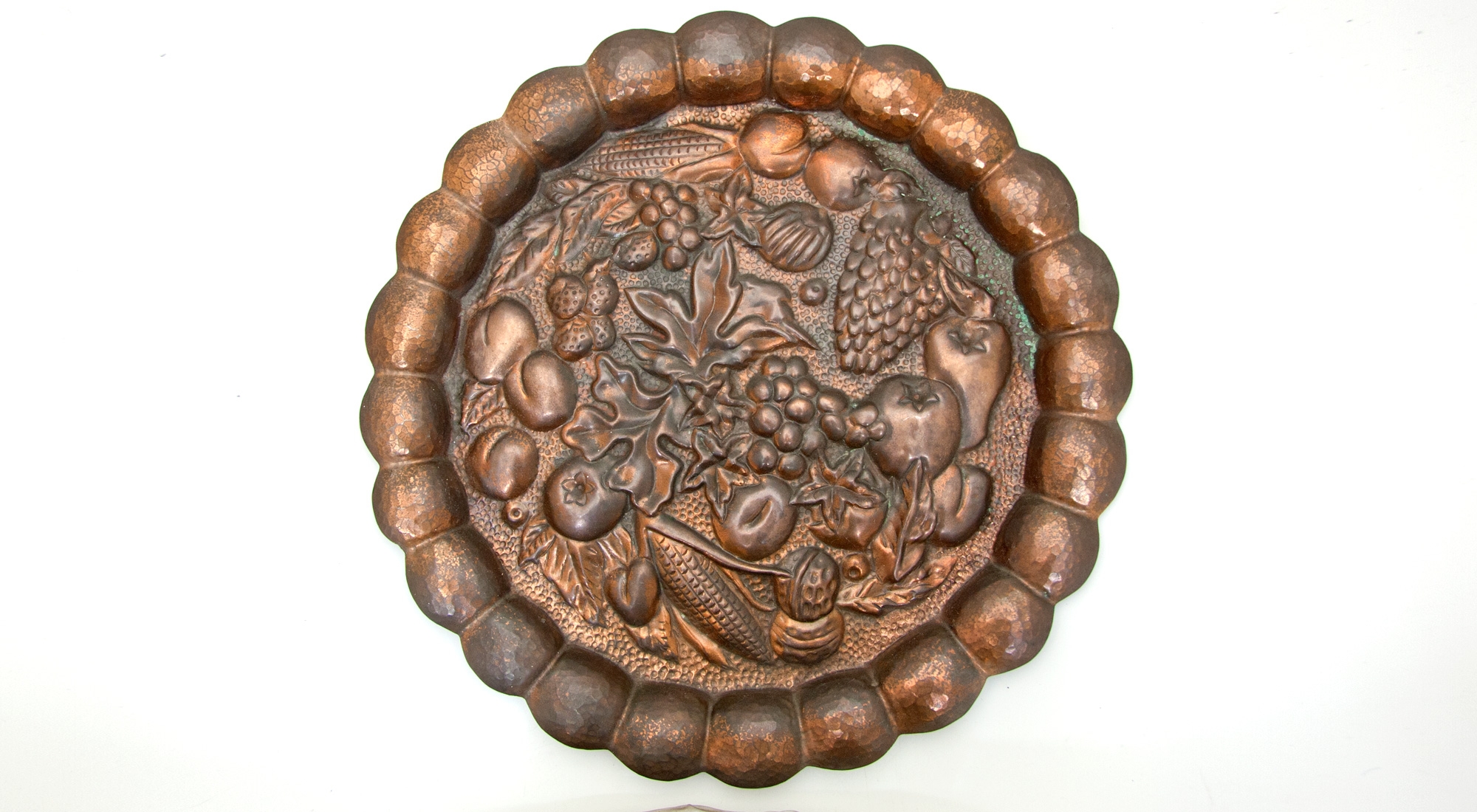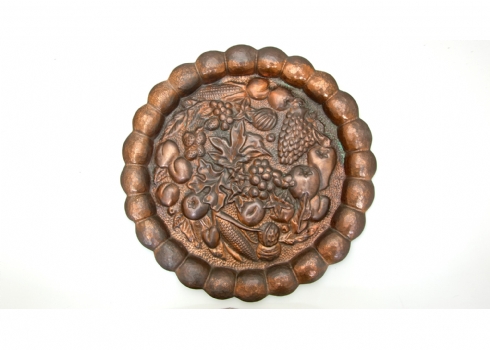 מספר הפריט בקטלוג 100צלחת נחושת גדולה ומרשימה לתליה על קיר המטבח או חדר האוכל, מרוקעת בעבודת יד אמן בדגם פירות וירקות ואימרת פלחים בהיקף, קוטר: 46 ס"מ.
