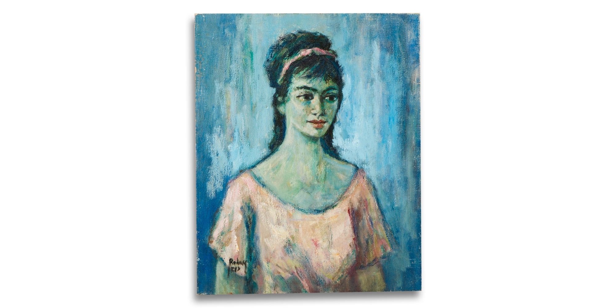 יהודה רודן - 'נערה בשמלה ורודה על רקע כחול', שמן על בד, חתום, מידות: 50.5X41 ס"מ.